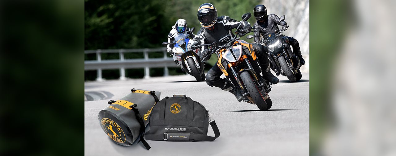 Motorradfahrer, die sich zwischen dem 1. März und 31. Juli 2021 für einen Satz ContiSportAttack 4, ContiRaceAttack 2/Street oder ContiRoad entscheiden, können als kostenlose Zugabe zwischen einer praktischen Helmtasche oder einer robusten Gepäckrolle wählen.