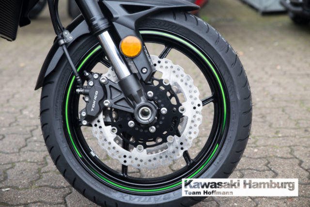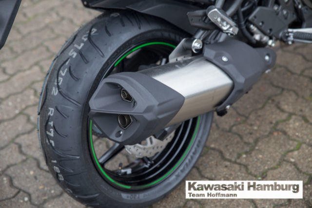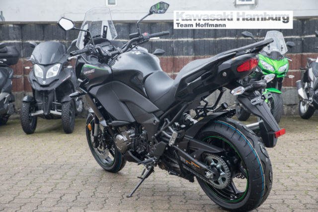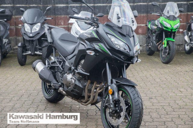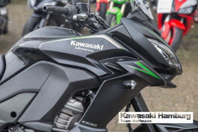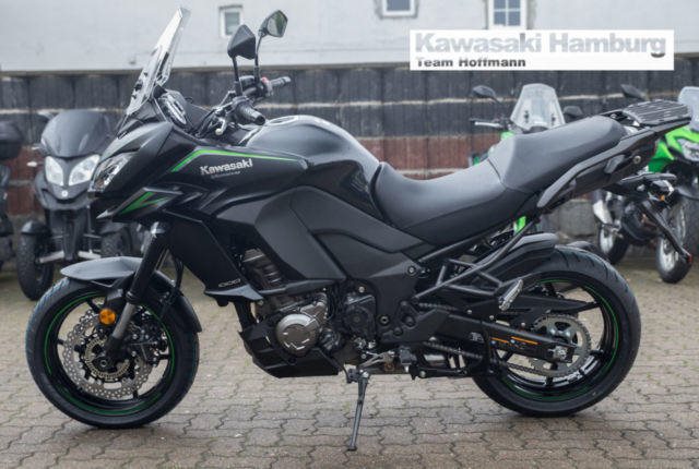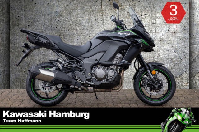 Modell 2018, inkl. Tourerpaket Du kannst mich auch günstig Mieten. 3 Tage ab 199,- Euro, 7 Tage ab 349,- Euro JEDE STRASSE ? JEDERZEIT Die Versys 1000 führt die Vielseitigkeit ihrer Vorgängerin fort und bietet weiterhin maximalen Fahrspaß in einem großen Bereich von Fahrsituationen auf der Straße. Ob solo oder zu zweit, ob mal eben um die Ecke oder durch die ganze Welt: die einzigartige Kombination aus dem drehfreudigen, auf Flexibilität abgestimmten Reihenvierzylinder und dem agilen Fahrwerk mit dynamischer Federung dieses Straßensportmotorrads sorgt für Fahrfreude und begeistert jeden Fahrer. Markantes, sportliches Styling Das komplett überarbeitete Stylingpaket kombiniert Stil, Windschutz, Aerodynamik und adäquaten Wärmehaushalt. Das neue Design mit Doppelscheinwerfern trägt zur beeindruckenden Kawasaki-Optik bei und unterstreicht das große Potenzial für eine sportliche Fahrweise. Hauptständer Ein serienmäßiger Hauptständer erleichtert Wartungsarbeiten. Scheibenbremsen im Petal-Design mit hochmodernem ABS Größere Scheiben vorn werden durch ein neues Bremsbelagmaterial, das ein festeres Zupacken gewährleistet, ergänzt. Das serienmäßige ABS bei allen Modellen bietet noch mehr Sicherheit beim Bremsen auf rutschiger oder unebener Straße. Dick gepolsterter Sitz Das dick gepolsterte, speziell entworfene Sitzmaterial bietet überragenden Komfort auf langen Strecken. Assist- und Rutschkupplung Die rennerprobte Kupplungstechnologie überzeugt durch eine Anti-Hopping-Funktion und weniger Kraftaufwand am Hebel. Einstellbarer Windschild Der Windschild ist in einem Bereich von 65 mm ohne Werkzeug einstellbar. Flüssigkeitsgekühlter Viertakt-Reihenvierzylinder Das leistungsstarke Triebwerk schiebt im gesamten Drehzahlband (insbesondere im unteren und mittleren Drehzahlbereich) mit Brachialgewalt bis in den roten Bereich. Das agile Ansprechverhalten und das mitreißende Ansauggeräusch sorgen für Begeisterung. Großer TankDas Fassungsvermögen von 21 Litern ermöglicht eine große Reichweite. Traktionskontrolle mit 3 Betriebsmodi (3-MODE KTRC) Das dreistufige KTRC kombiniert die besten Eigenschaften der beiden Traktionskontroll-Systeme von Kawasaki, S-KTRC und KTRC. Die drei Stufen decken eine Vielzahl von Fahrsituationen ab. Probefahrten auf allen Modellen möglich Bundesweiter Zulassungsdienst Gerne nehmen wir Ihr Fahrzeuge in Zahlung Finanzierungen ohne Anzahlung sind möglich Motorradvermietung Unser Team freut sich auf Ihren Besuch, und berät sie gerne Unsere Öffnungszeiten: Mo.- Fr. 09:00 bis 18.00 Uhr Sa. 10:00 bis 16.00 Uhr oder nach Vereinbarung Irrtümer, Zwischenverkauf und Änderungen vorbehalten.