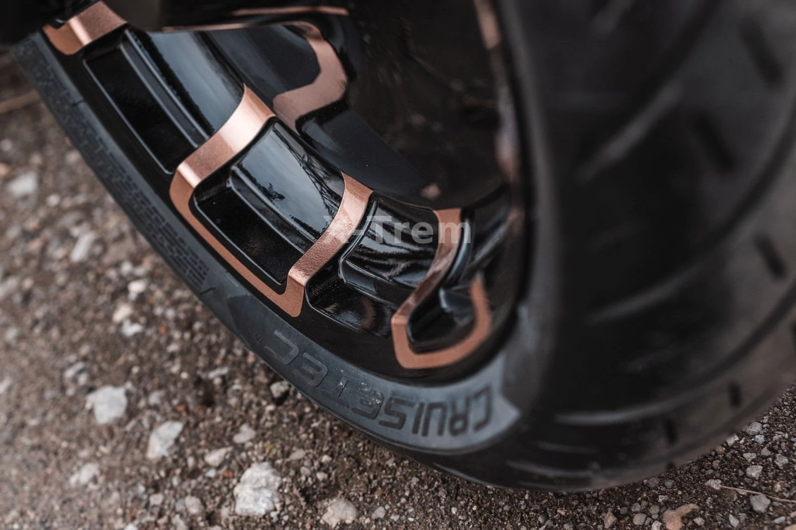 - X-Trem Breitreifenumbau mit 280/35 R 18 Metzeler auf Felge HD 9,5 x 18 schwarz hochglanz mit bronzenen Designapplikationen