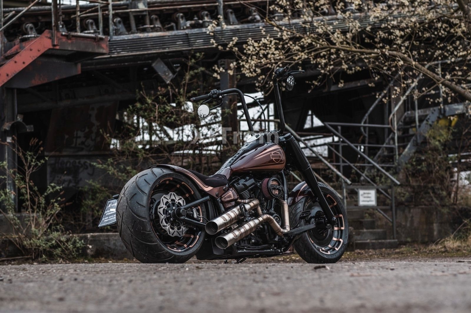 Nach unserer Leistungskur und Abstimmung waren selbst wir erstaunt, das durch die wirklich geringfügigen Veränderungen 118 PS am Hinterrad erreicht wurden. Das entspricht einer Kurbelwellenleistung von ca. 130 PS. Die Leistungsentfaltung ist sehr homogen, und die Gasannahme kein Vergleich zur Serie. Damit ist Fahrspaß pur garantiert. Hinten kommt ein Airride zum Einsatz,welches nicht nur stufenlos in der Höhe einstellbar ist,sondern im Gegensatz zu dem handelsüblichen Systemen auch in jeder Höhe stufenlos härter abzustimmen ist. Damit hat das rumgeeiere auch zwischen der Einstellung ganz unten (starr) und ganz oben ein Ende. Wir haben alles kompromisslos schwarz beschichtet. Unter anderem auch das hässliche Innenleben des Scheinwerfers und dessen Halter, was Harley bei den Fat-Boy's offensichtlich vergessen hat. Es wurde ein 43 cm Ape für eine coole und rückenschonende Sitzhaltung montiert. Alle unzähligen weiteren Änderungen findet Ihr untenstehend aufgelistet.