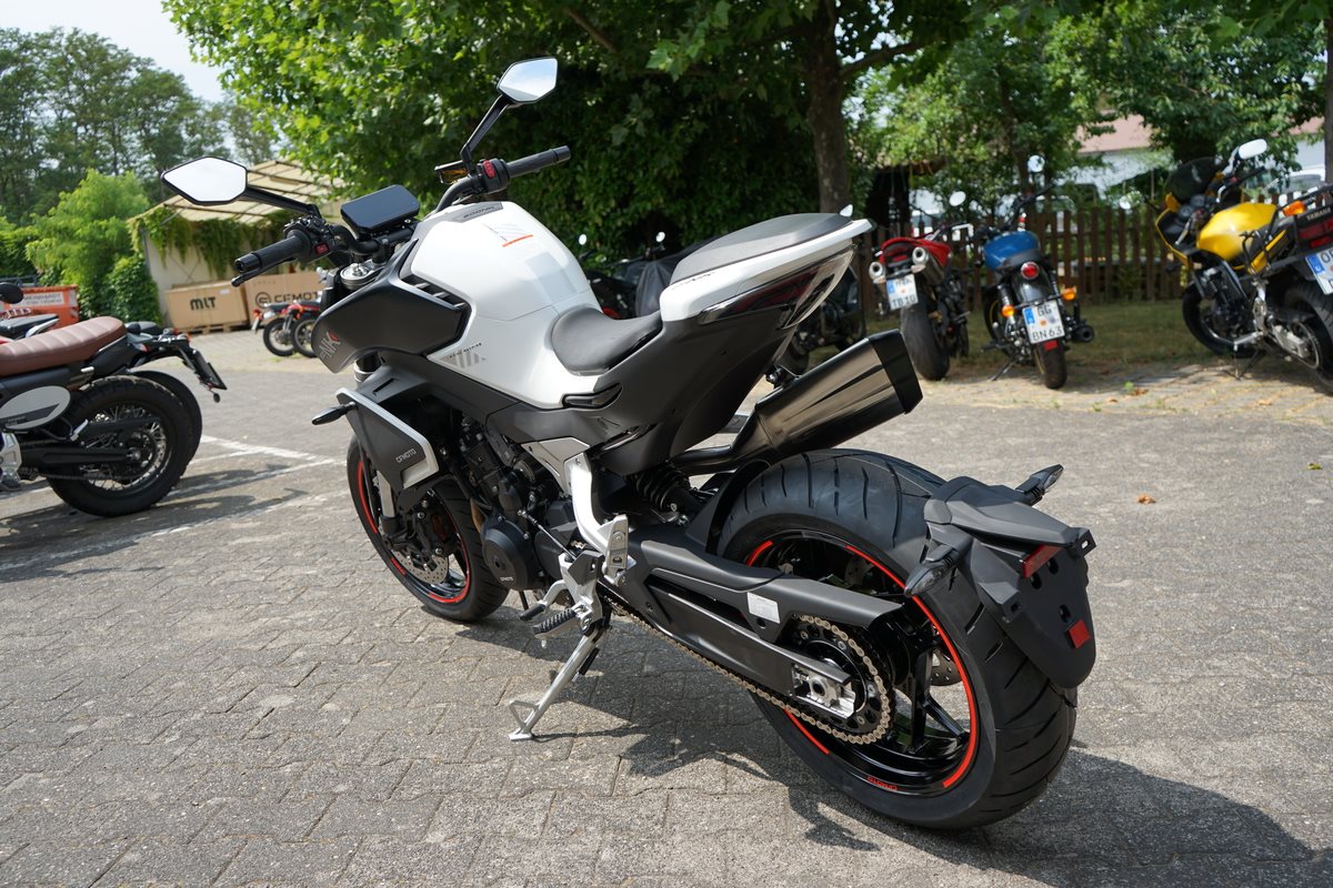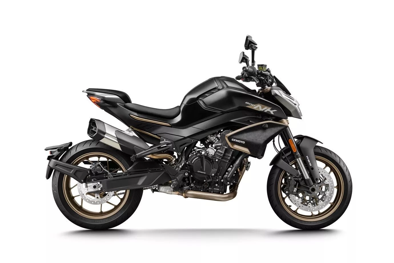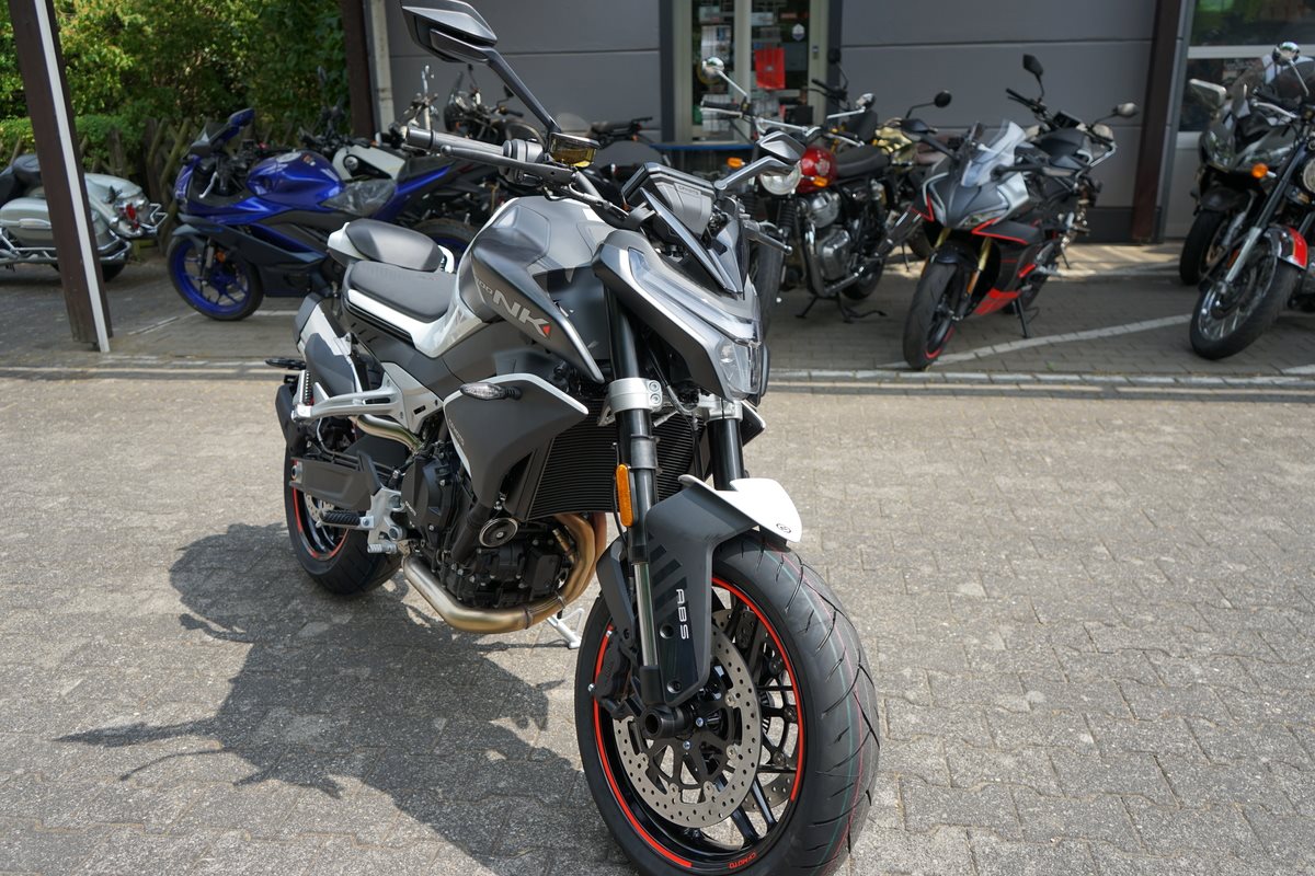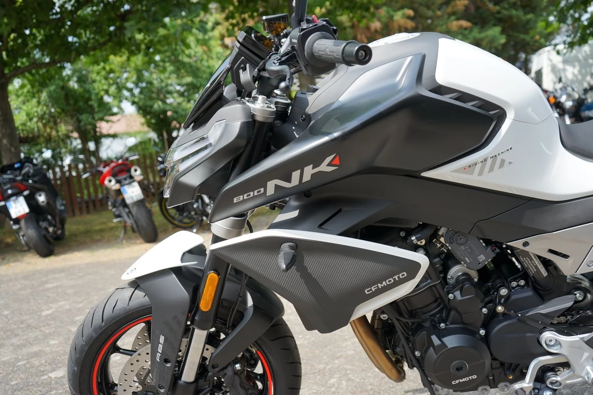 - Technische Basis ist die KTM 790 Duke, deren Motor CFMoto bereits in der 800 MT einsetzt. Bekannt wurde er 2017 in der 790 Duke, holte aus 799 Kubik drehfreudige und drehgierige 105 PS. In der CFMoto 800 NK leistet er 70 kW, also 95 PS und erfüllt damit die A2-Grenze von maximal 70 Kilowatt, die auf A2-taugliche 48 PS gedrosselt werden dürfen. Auf die Waage bringt die CFMoto 800 NK 186 Kilogramm. Damit ist sie ein Kilogramm leichter als die 790 Duke, bei fast gleicher Zuladung von 180 Kilogramm. 5-Zoll-TFT-Cockpit, Konnektivität, voll einstellbare 43-mm-Upside-Down-Gabel und hinterer Stoßdämpfer von KYB (Kayaba), Alu-Räder, J.Juan-Radialbremssättel mit vier Kolben und 320-mm-Bremsscheiben an der Vorderachse gehören zur Serienausstattung der CFMoto 800 NK Sport. Reifen in den Dimensionen 120/70 ZR 17 vorn und 180/55 ZR 17 hinten stehen in der Achsmitte 1.465 Millimeter auseinander.