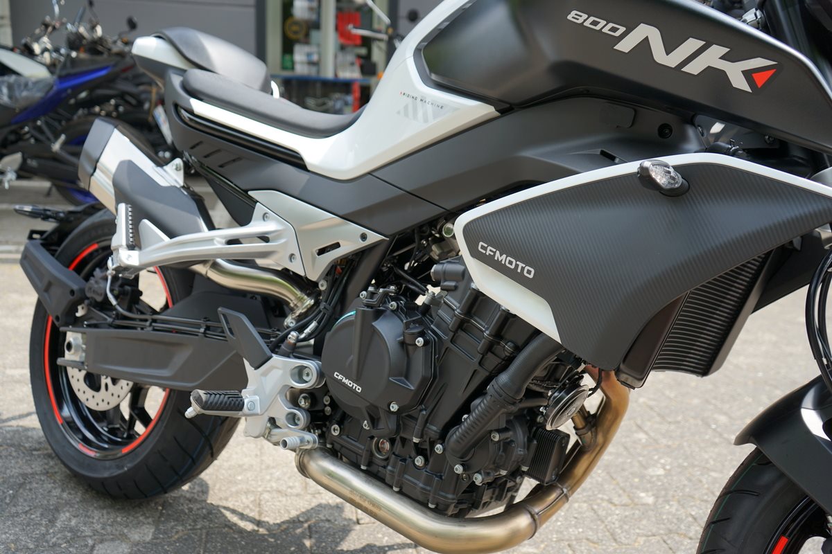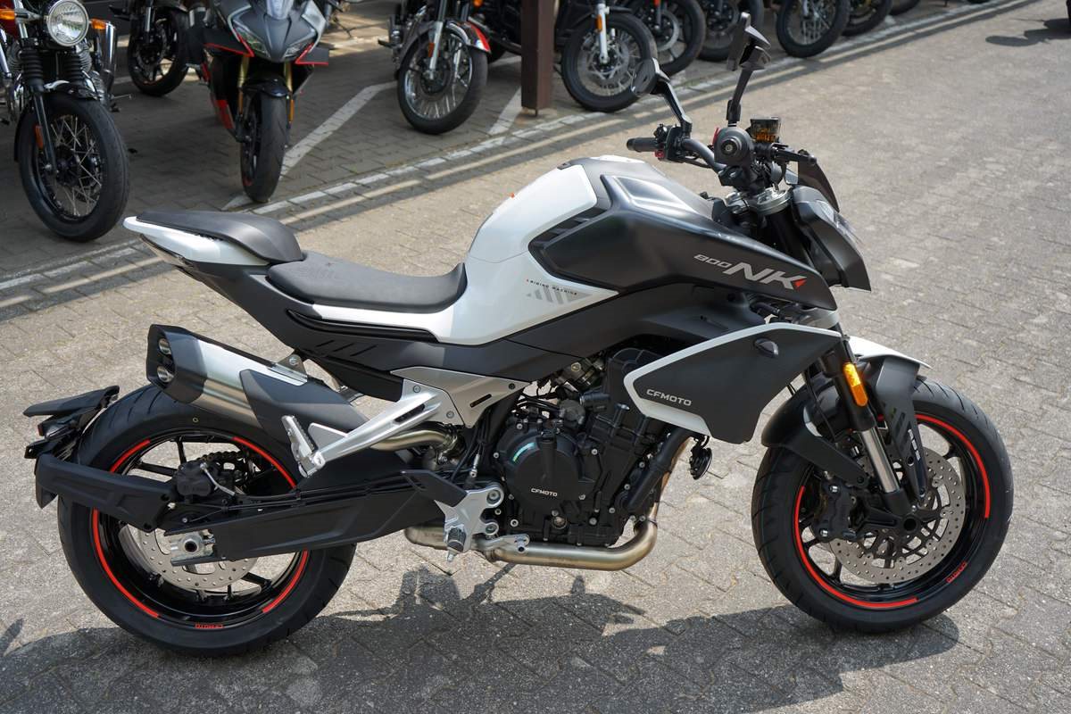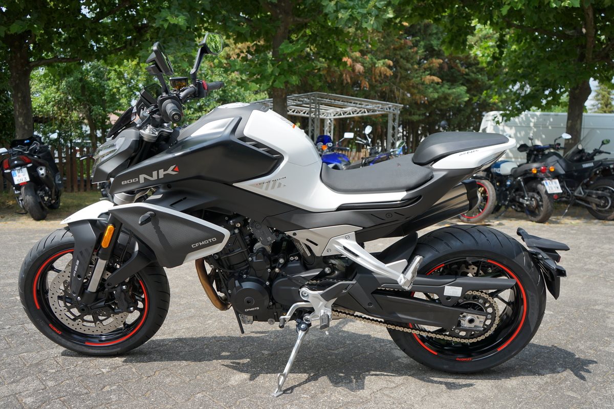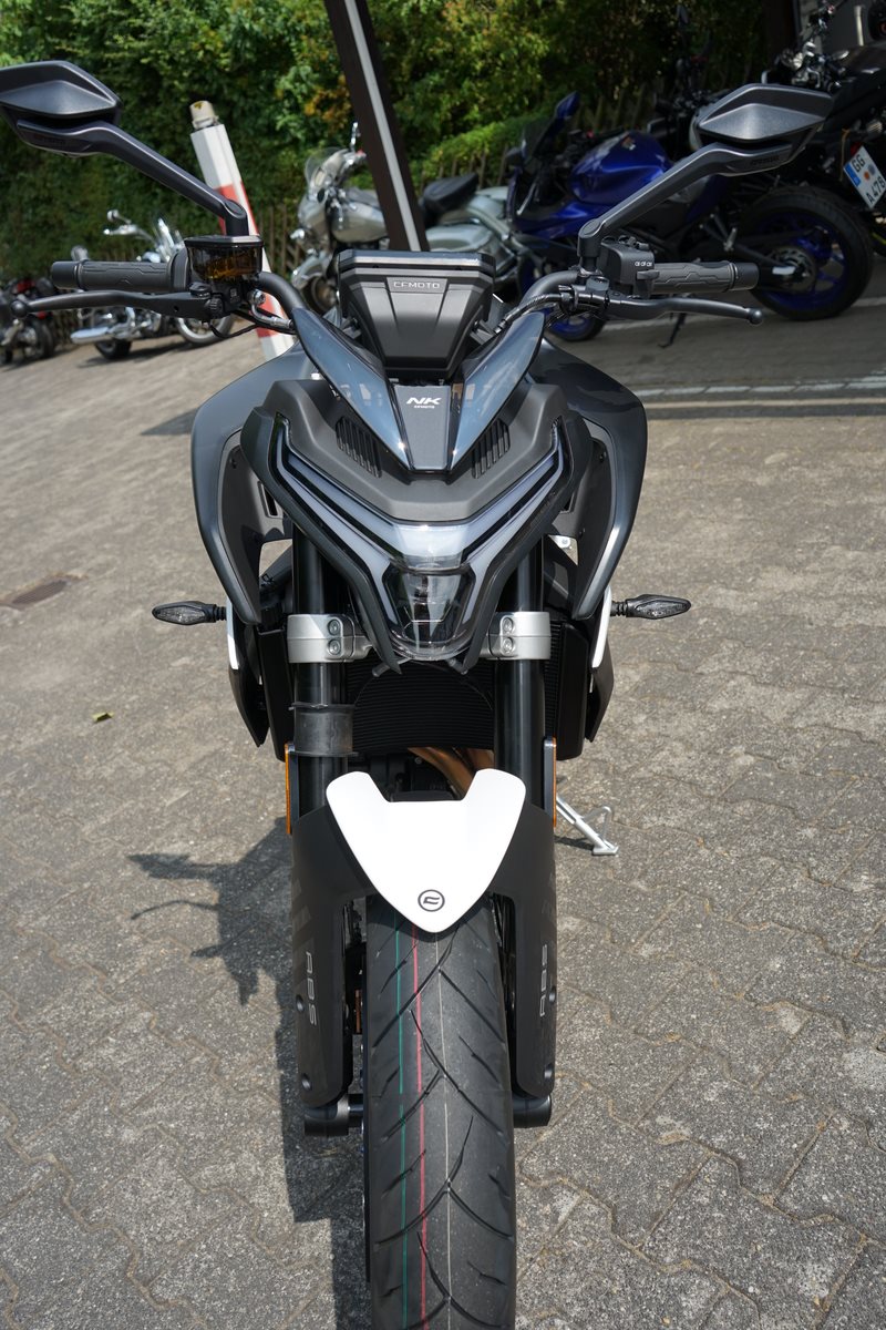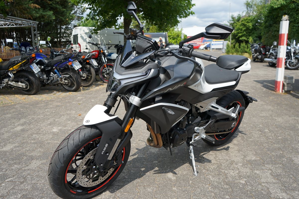 - Technische Basis ist die KTM 790 Duke, deren Motor CFMoto bereits in der 800 MT einsetzt. Bekannt wurde er 2017 in der 790 Duke, holte aus 799 Kubik drehfreudige und drehgierige 105 PS. In der CFMoto 800 NK leistet er 70 kW, also 95 PS und erfüllt damit die A2-Grenze von maximal 70 Kilowatt, die auf A2-taugliche 48 PS gedrosselt werden dürfen. Auf die Waage bringt die CFMoto 800 NK 186 Kilogramm. Damit ist sie ein Kilogramm leichter als die 790 Duke, bei fast gleicher Zuladung von 180 Kilogramm. 5-Zoll-TFT-Cockpit, Konnektivität, voll einstellbare 43-mm-Upside-Down-Gabel und hinterer Stoßdämpfer von KYB (Kayaba), Alu-Räder, J.Juan-Radialbremssättel mit vier Kolben und 320-mm-Bremsscheiben an der Vorderachse gehören zur Serienausstattung der CFMoto 800 NK Sport. Reifen in den Dimensionen 120/70 ZR 17 vorn und 180/55 ZR 17 hinten stehen in der Achsmitte 1.465 Millimeter auseinander.