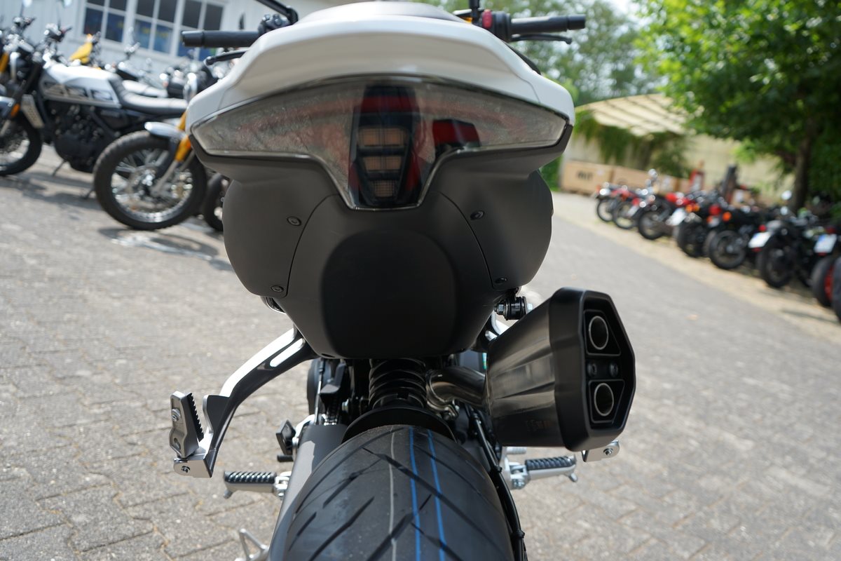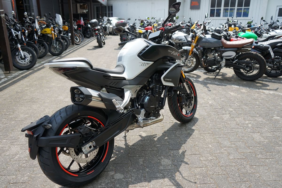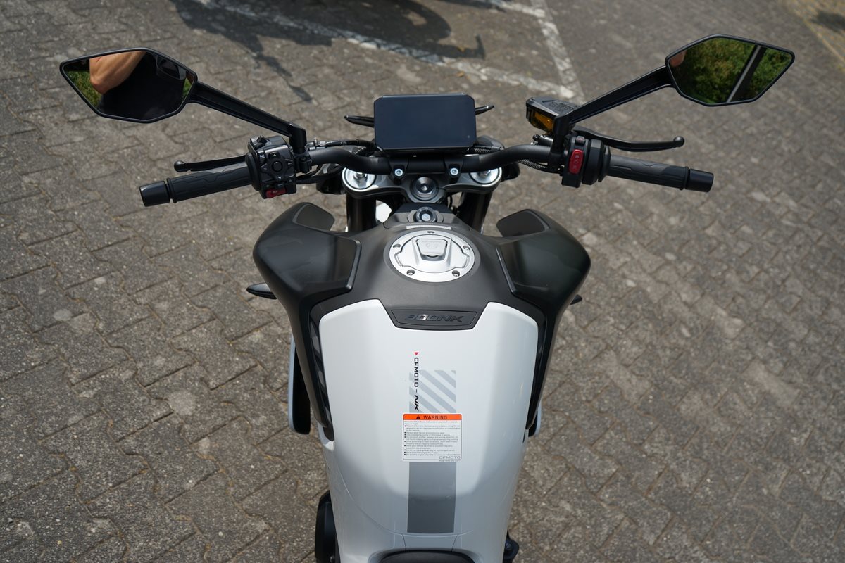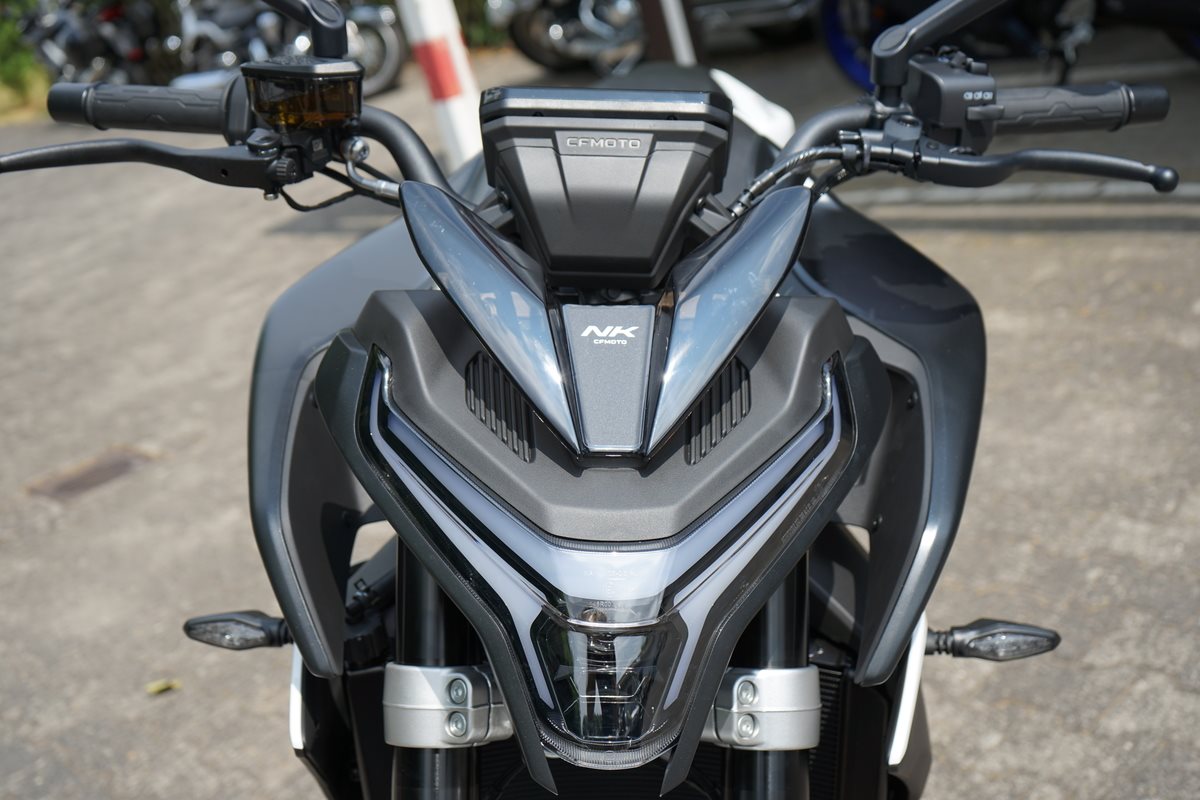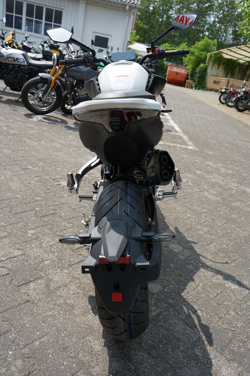 - Technische Basis ist die KTM 790 Duke, deren Motor CFMoto bereits in der 800 MT einsetzt. Bekannt wurde er 2017 in der 790 Duke, holte aus 799 Kubik drehfreudige und drehgierige 105 PS. In der CFMoto 800 NK leistet er 70 kW, also 95 PS und erfüllt damit die A2-Grenze von maximal 70 Kilowatt, die auf A2-taugliche 48 PS gedrosselt werden dürfen. Auf die Waage bringt die CFMoto 800 NK 186 Kilogramm. Damit ist sie ein Kilogramm leichter als die 790 Duke, bei fast gleicher Zuladung von 180 Kilogramm. 5-Zoll-TFT-Cockpit, Konnektivität, voll einstellbare 43-mm-Upside-Down-Gabel und hinterer Stoßdämpfer von KYB (Kayaba), Alu-Räder, J.Juan-Radialbremssättel mit vier Kolben und 320-mm-Bremsscheiben an der Vorderachse gehören zur Serienausstattung der CFMoto 800 NK Sport. Reifen in den Dimensionen 120/70 ZR 17 vorn und 180/55 ZR 17 hinten stehen in der Achsmitte 1.465 Millimeter auseinander.