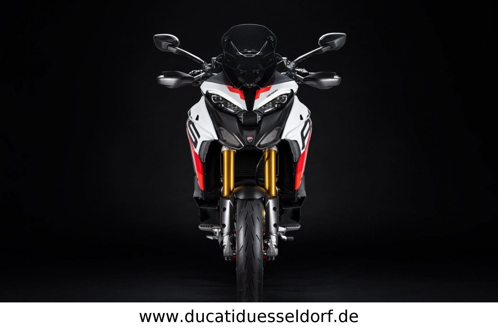 Öhlins Smart EC 2.0 (elektronische Federung), Ducati Quick Shift, Hands Free-System, beleuchtete Bedienelemente, 6,5-Zoll-TFT-Farbdisplay mit Ducati Connect und Karten-Navigation, Voll-LED-Scheinwerfer, vorderer Kotflügel und Frontverkleidung aus Carbon, Handprotektoren aus Carbon, Titan-Endschalldämpfer von Akrapovic
