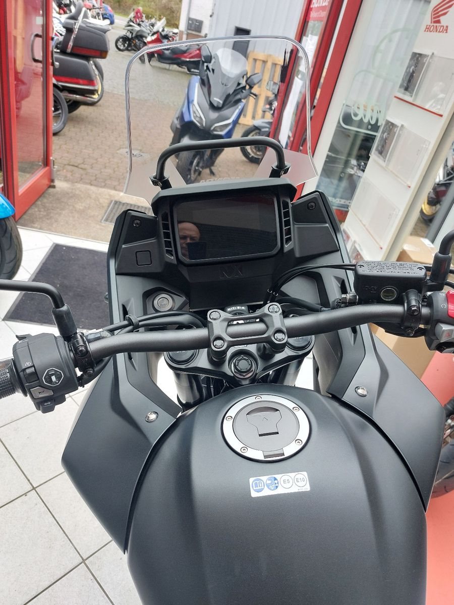 Honda NX500 Neufahrzeug mit Tageszulassung 11/25, 5 Zoll TFT Farbdisplay mit Konnektivität, HSTC Traktionskontrolle, Notbremssignal, Upside Down Gabel, LED Beleuchtung, Euro 5+, CO2 kombiniert 82g/km, Kraftstoffverbrauch nach WMTC 3,6 l/100Km, Gewicht vollgetank 196kg.