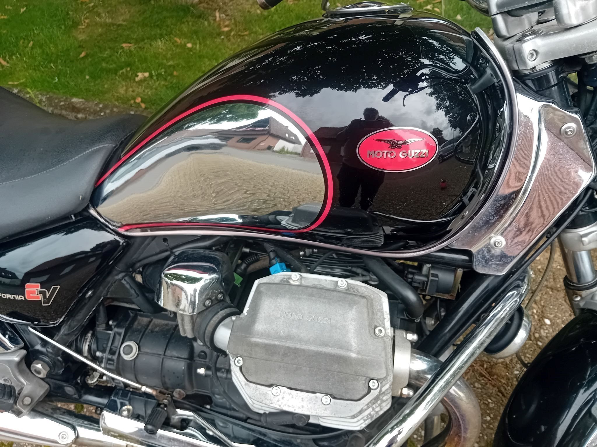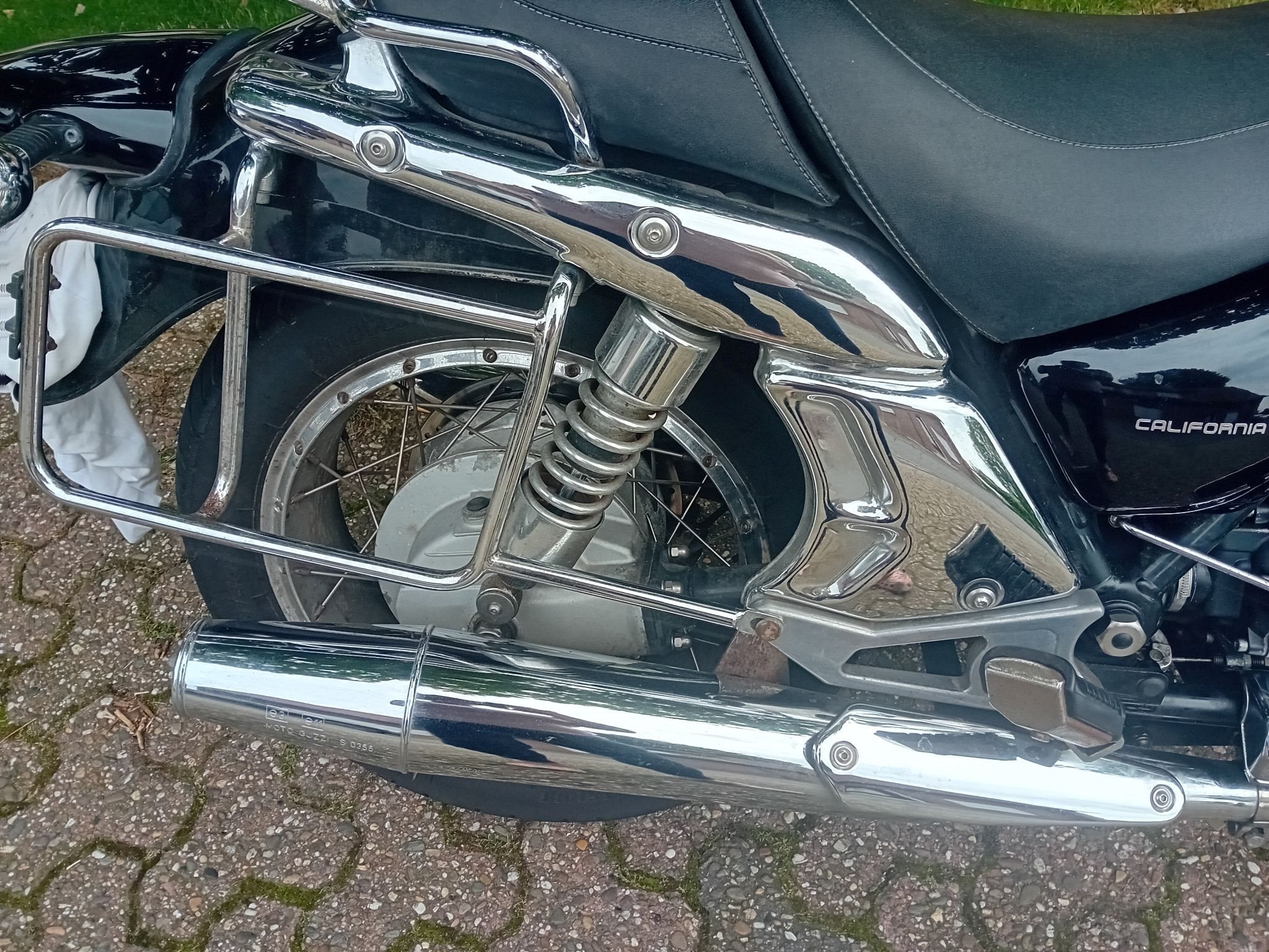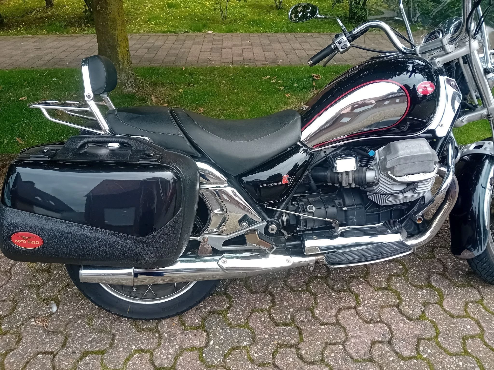 Zugelassene, nach Service und Einbau neuer Batterie bis 07/2026 geTÜVte Guzzi California mit 2 Original Koffern und Windschild steht zum Verkauf. Zweimal innerhalb der Familie weitergegeben, aber für mich als Endsechziger unterdessen ein bisschen zu schwer. (Nicht vollständig gefülltes) Serviceheft, Originalbeschreibung und letzte Werkstattrechnungen sind vorhanden. Die Reifen sind in gutem Zustand, knapp zwei Jahre alt.