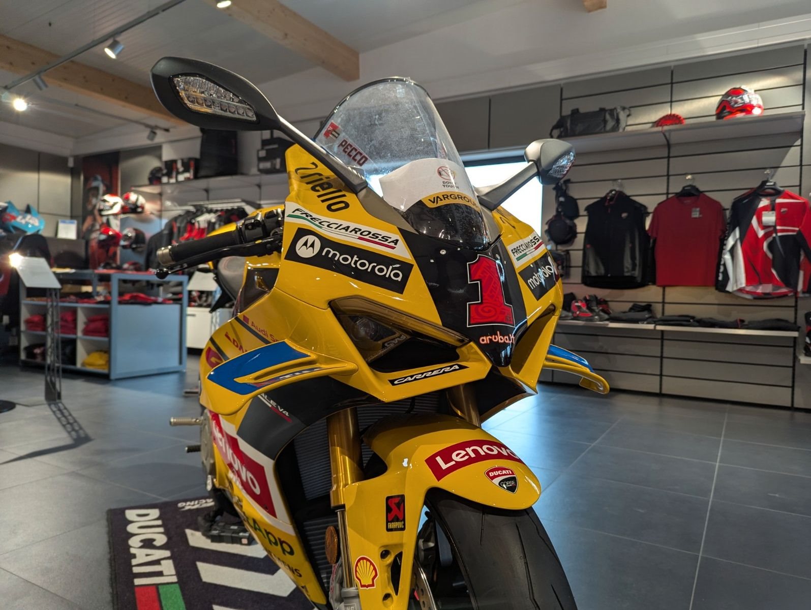 Das Motorrad ist von der exklusivsten Lackierung der Saison inspiriert: der Giallo Ducati-Lackierung, mit der die Desmosedici GP23 des Ducati Lenovo Teams beim GP von Misano auf die Strecke ging. Eine Farbe, die eine wichtige Tradition in der Sportgeschichte von Ducati hat.