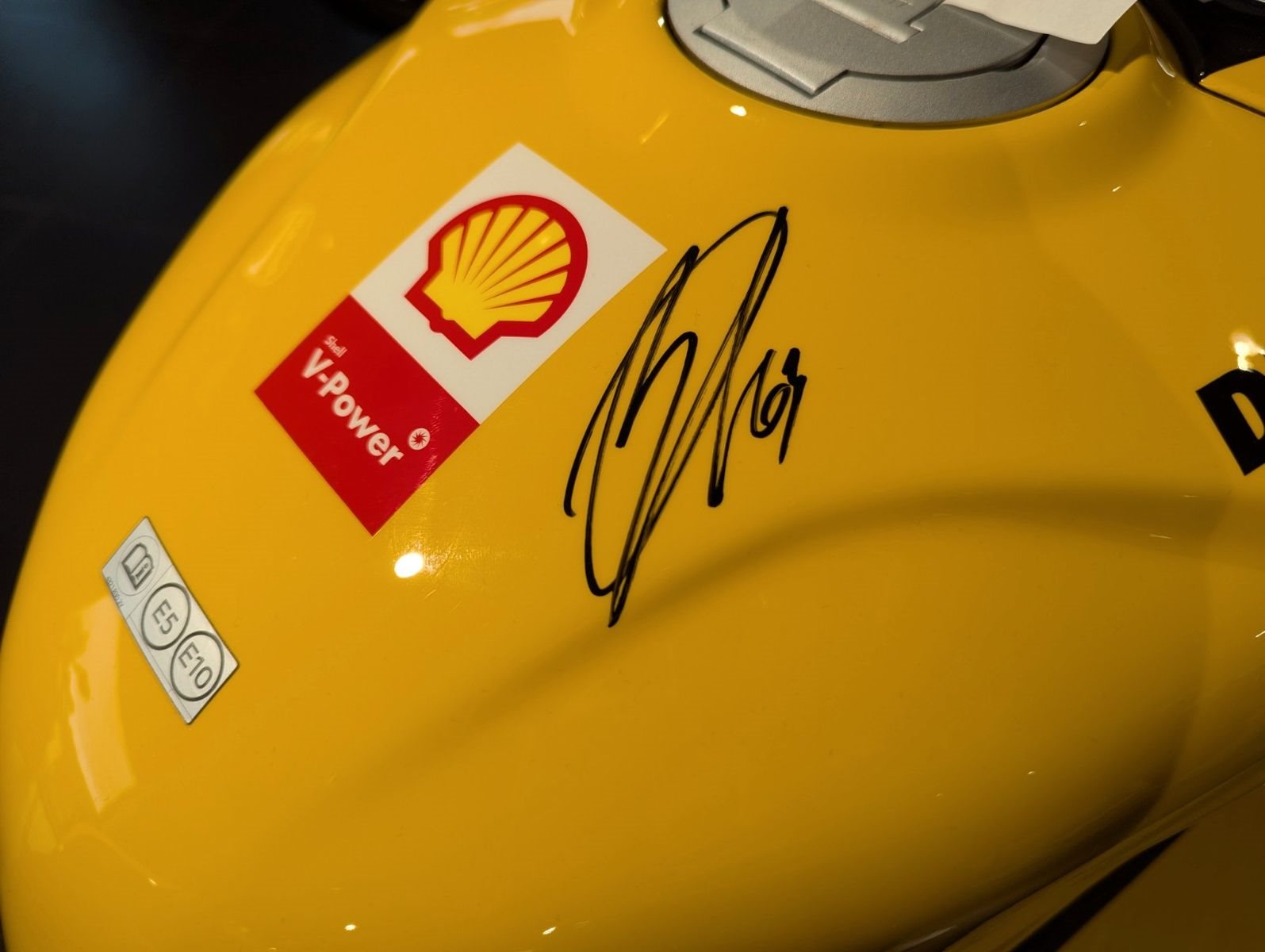 - Obere Gabelbrücke aus Billet-Aluminium mit Name und Nummer des MotorradsVom Fahrer persönlich signierter Kraftstofftank