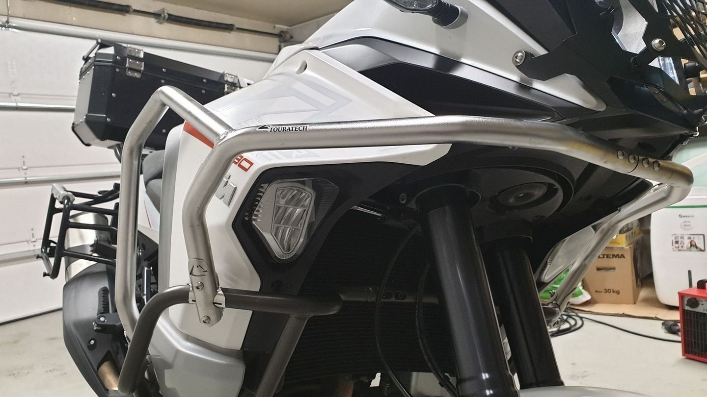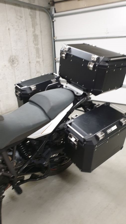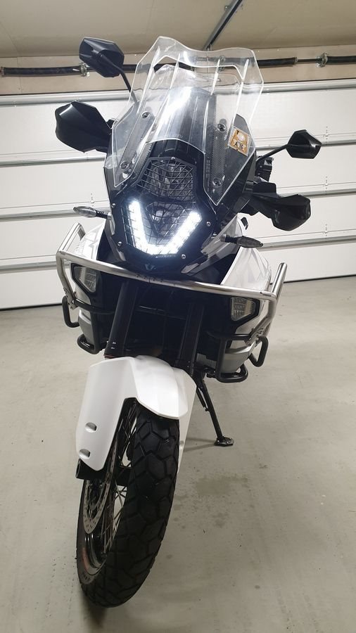 Tolles und vielseitiges Tourenrad auf Asphalt und Schotter. Zusätzlicher Rollback und Lampenschutz (Touratec). Zusätzliche Blöcke, um das Board höher zu bringen. Givi Trekker 37 L und 48 L Seitenkästen mit Innentaschen. Givi Trekker 58 L Top Box fasst 2 Helme. Garmin Zumo 590 mit abscVhließbarer Halterung (Touratec).