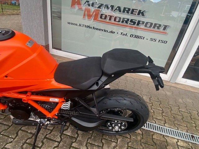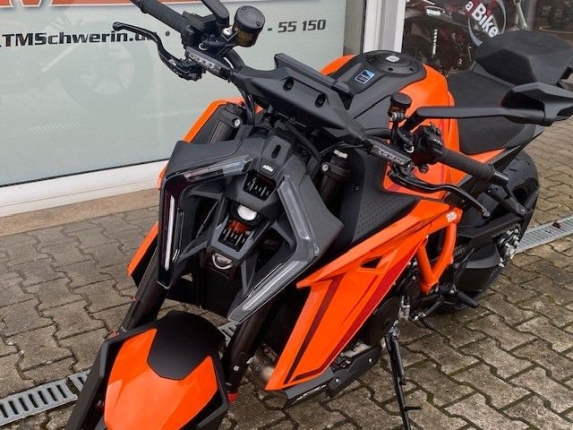 Damit man nicht dauernd auf dem Hinterrad durch die Landschaft fährt, bewirken neue Tankspoiler und zusätzliche Winglets mehr Anpressdruck am Vorderrad. Der überarbeitete Kraftstofftank fasst nun 17,5 Liter und damit 1,5 Liter mehr als sein Vorgänger. Diese Veränderung erhöht nicht nur die Reichweite auf etwa 300 km, sondern erfüllt auch eine ergonomische Funktion.Die neue Scheinwerfereinheit wiegt fast 700 g weniger als die Vorgängerversion und wirkt nahezu außerirdisch. Neu ist auch die Coming Home-Lichtfunktion. Der Scheinwerfer bleibt nach dem Ausschalten der Zündung noch für eine gewisse Dauer eingeschaltet; hilfreich beim Abstellen des Motorrads in dunkler Umgebungen.In Sachen Elektronik debütiert die 1390er Super Duke mit einem überarbeiteten Performance- und Track-Fahrmodus, komplett mit Laptimer- und Telemetrie-Statistiken, sowie einer optionalen Motorbremssteuerung .