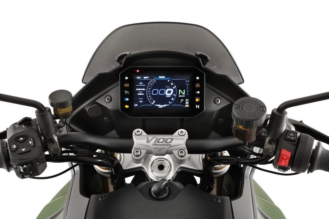 Bereits beim Beschleunigen aus dem unteren Drehzahlbereich spürt man den kernigen, kraftvollen Charakter der neuen Moto Guzzi V100. 115 PS bei 8.800 U/min und ein maximales Drehmoment von 105 Nm bei 6.750 U/min sind angesagt. Komfortabel sorgt ein Quickshifter für extrem schnelle, sanfte Gangwechsel und verleiht dem Fahrerlebnis noch Dynamik.