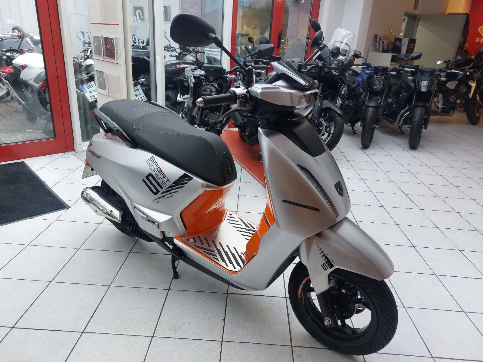 Peugeot Django neu 125 Sport, silber Orange, Vorführfahrzeug, ABS, Euro 5, TFT Display mit Konnektivität, USB Anschluß, Tagfahrlicht, Warnblinker.