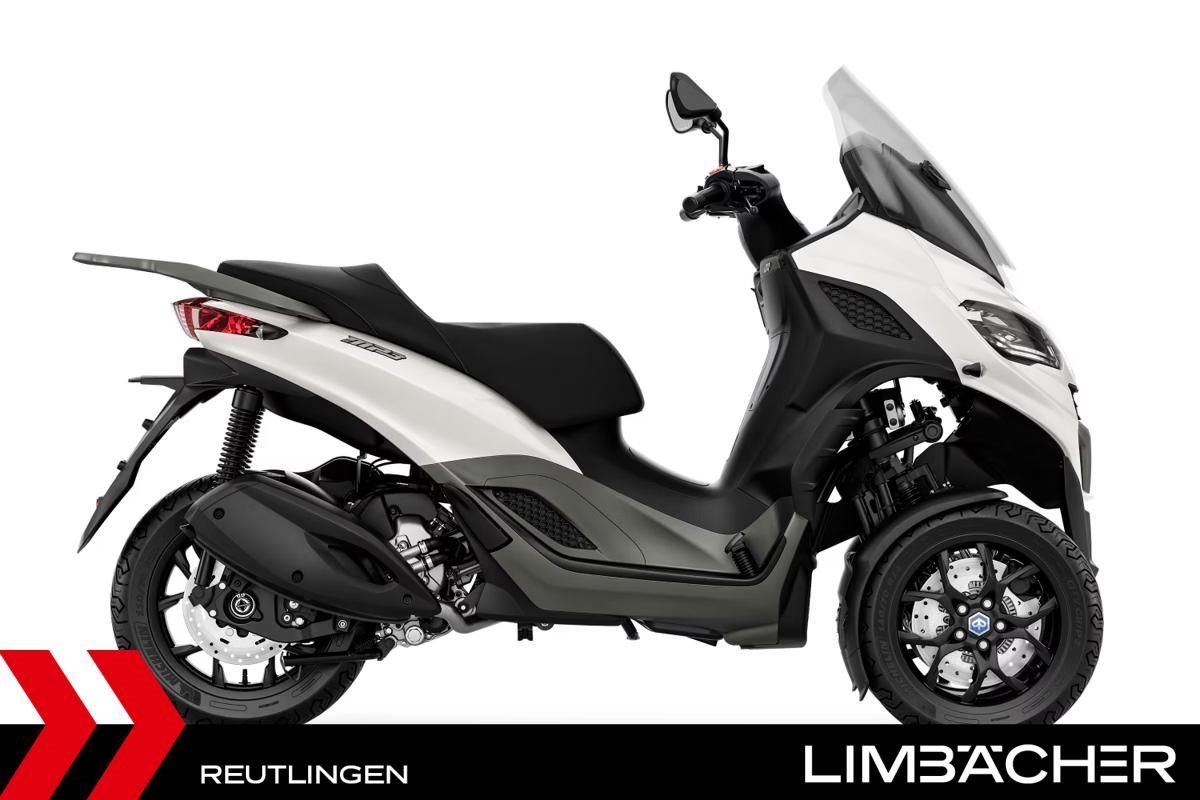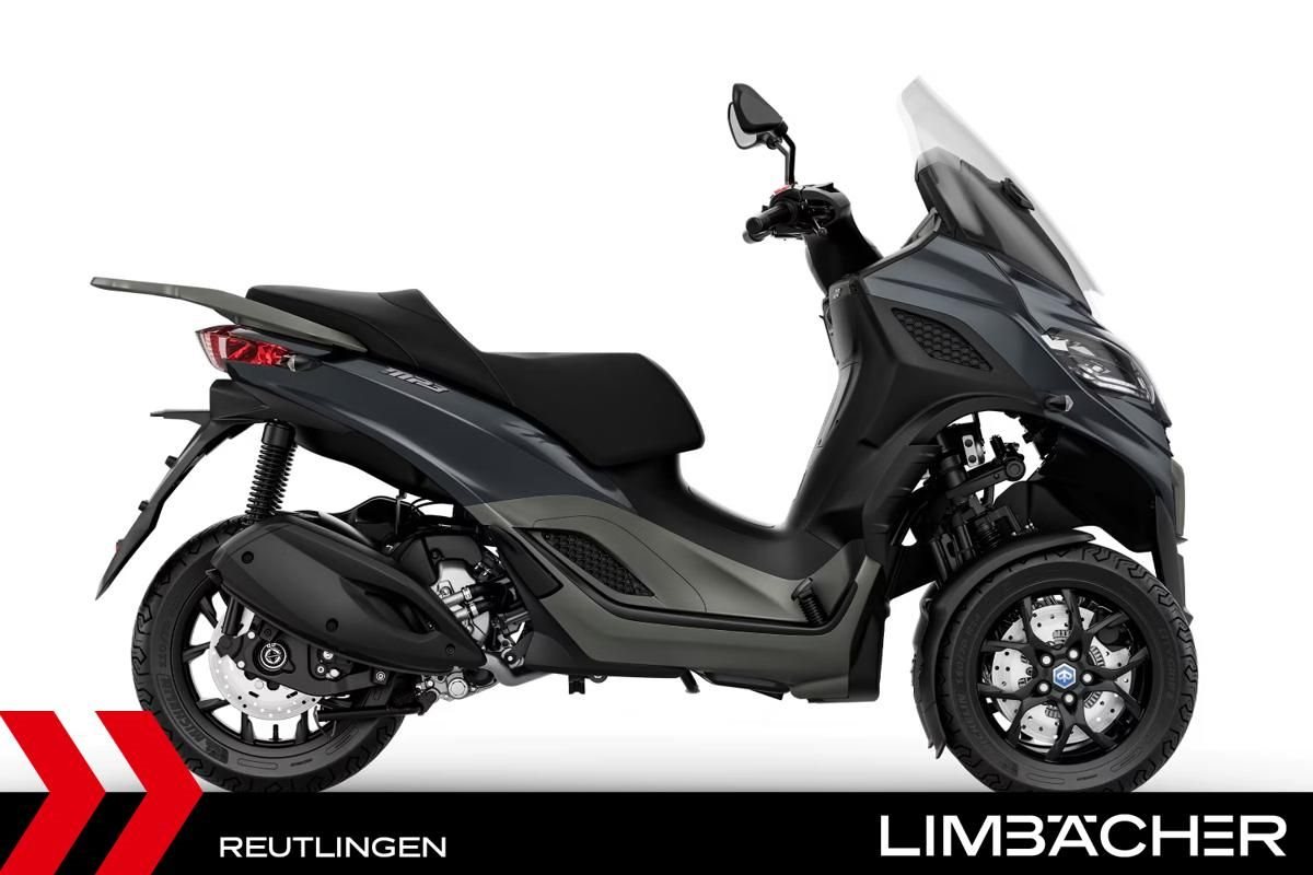 Der Piaggio MP 310, der mit einem PKW-Führerschein Klasse B gefahren werden kann, überzeugt durch seinen kühnen, dynamischen Stil, der von den neuesten Trends im Automobildesign inspiriert ist. Metallisch graue, satinierte Details betonen die fließenden Linien, während die Sitzbank mit grauen Texturen und kontrastierenden grauen Nähten versehen ist.