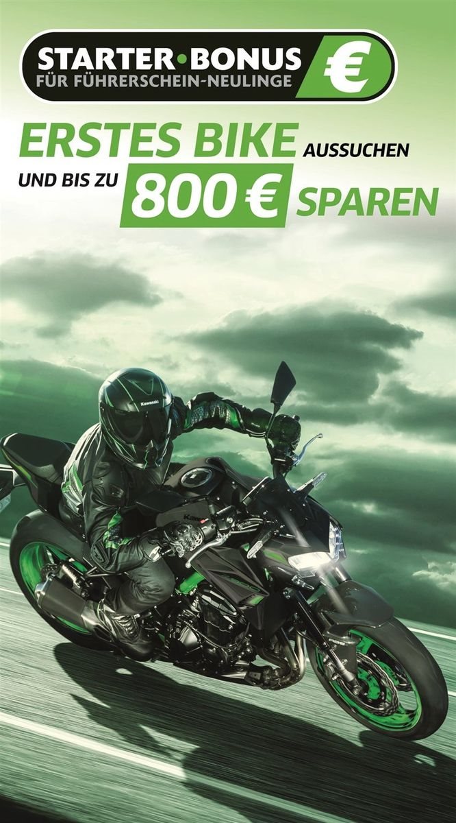 AB SOFORT: KAWASAKI STARTER-BONUS in HÖHE von EUR: 650,00 - für Führerschein-Neulinge (A/A2) - Erwerb innerhalb der letzten 12 Monate !