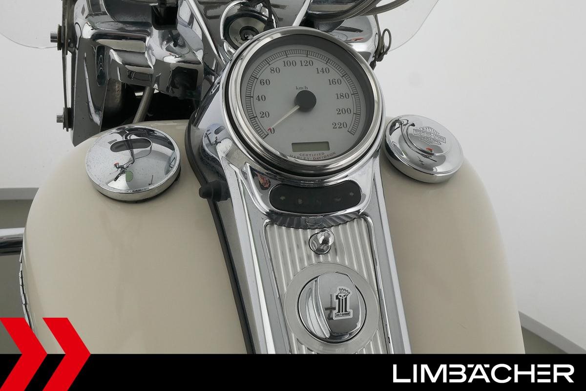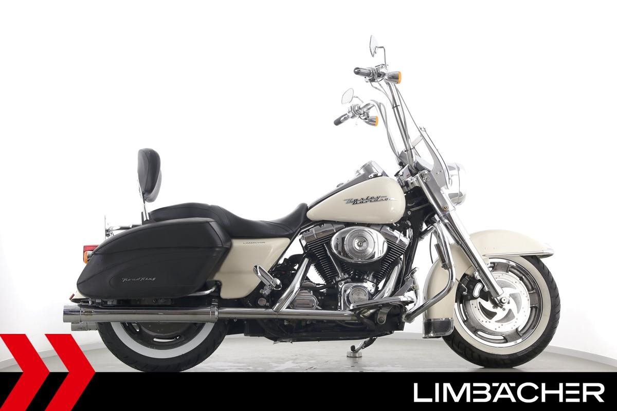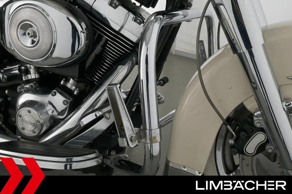 Eine Harley-Davidson Road King Custom FLHRSI in gepflegtem Zustand u.a. mit Penzl-Klappenauspuff manuell sowie Sturzbügeln.