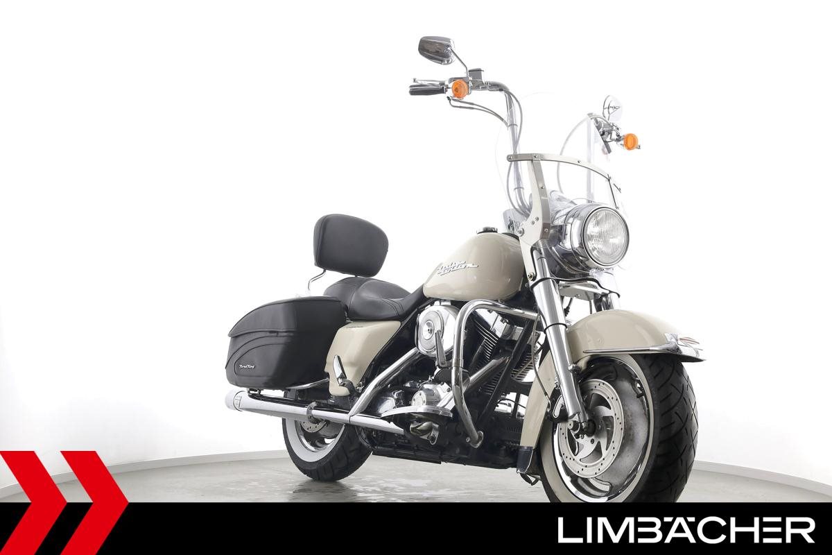 Eine Harley-Davidson Road King Custom FLHRSI in gepflegtem Zustand u.a. mit Penzl-Klappenauspuff manuell sowie Sturzbügeln.