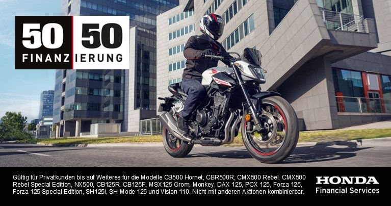 Erfüllen Sie sich jetzt den Traum vom neuen Honda Motorrad - mit unserem attraktiven 50:50 Finanzierungsmodell:* 50 % Anzahlung bei Vertragsbeginn