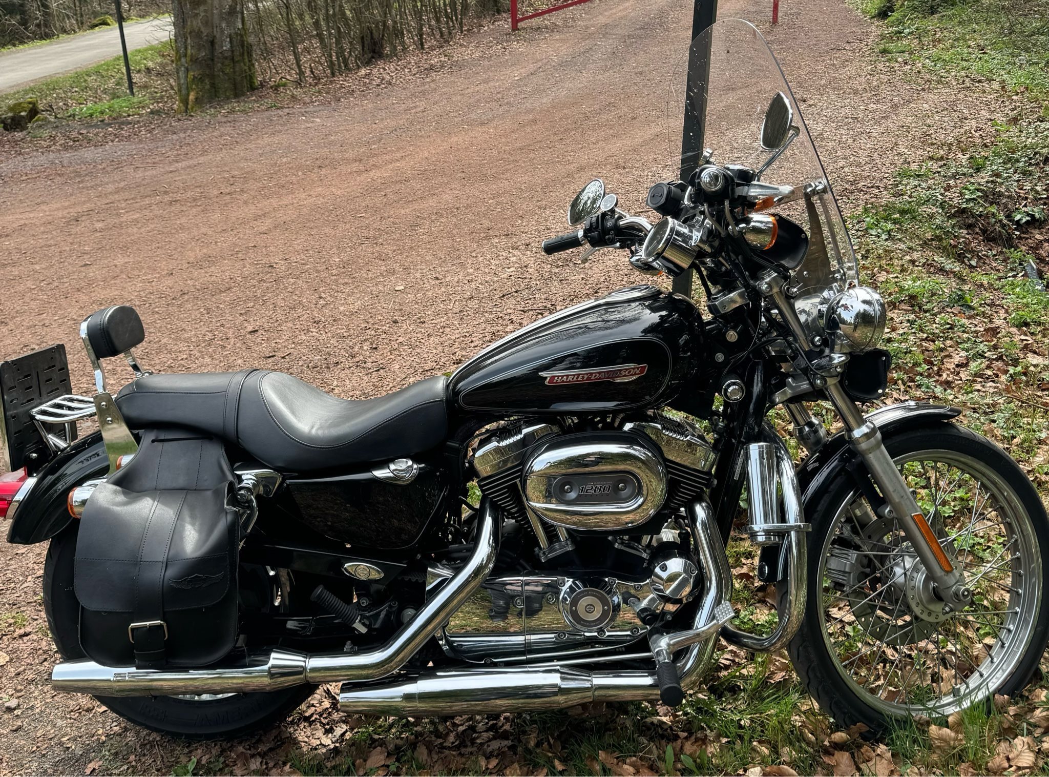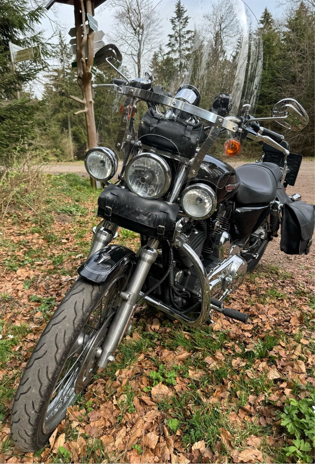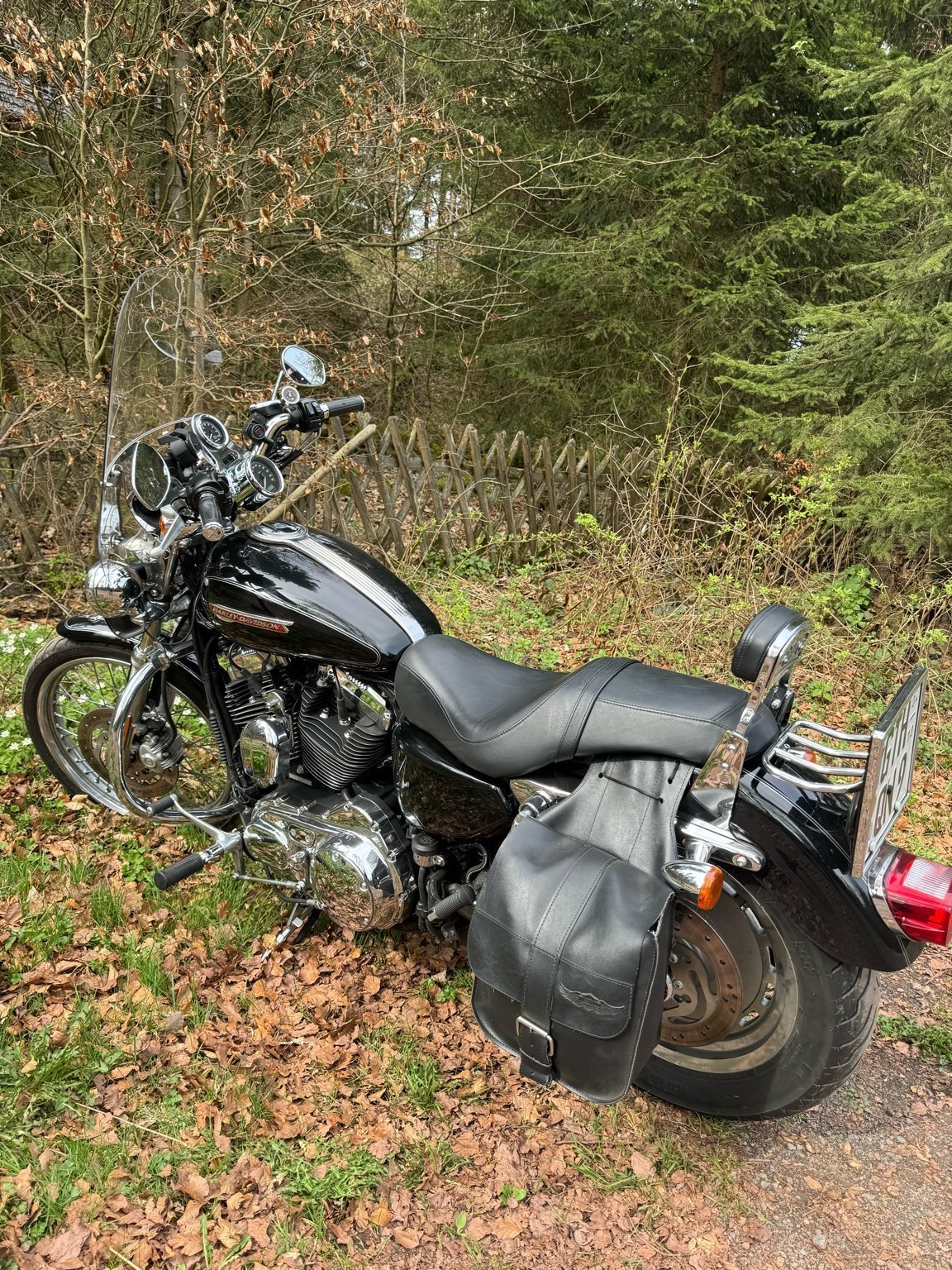 Gebe meine Checkheft-gewartete und sehr gut gepflegte Harley Sporty XL 1200 Custom ab. TÜV bis August 2027. Sondermodell schwarz mit Folierungsstreifen, viele originale Harley-Extras: z.B. Doppelsitzbank, Windschild (2. Windschild abnehmbar mit Schnellverschlüssen dabei), Motorschutzbügel mit Tube und Helmschloss, Nebelscheinwerfer, Drehzahlmesser, Heckgepäckträger, Sissybar, Seitensatteltaschen an Haltern, Lenkertaschen-und Instrumente.