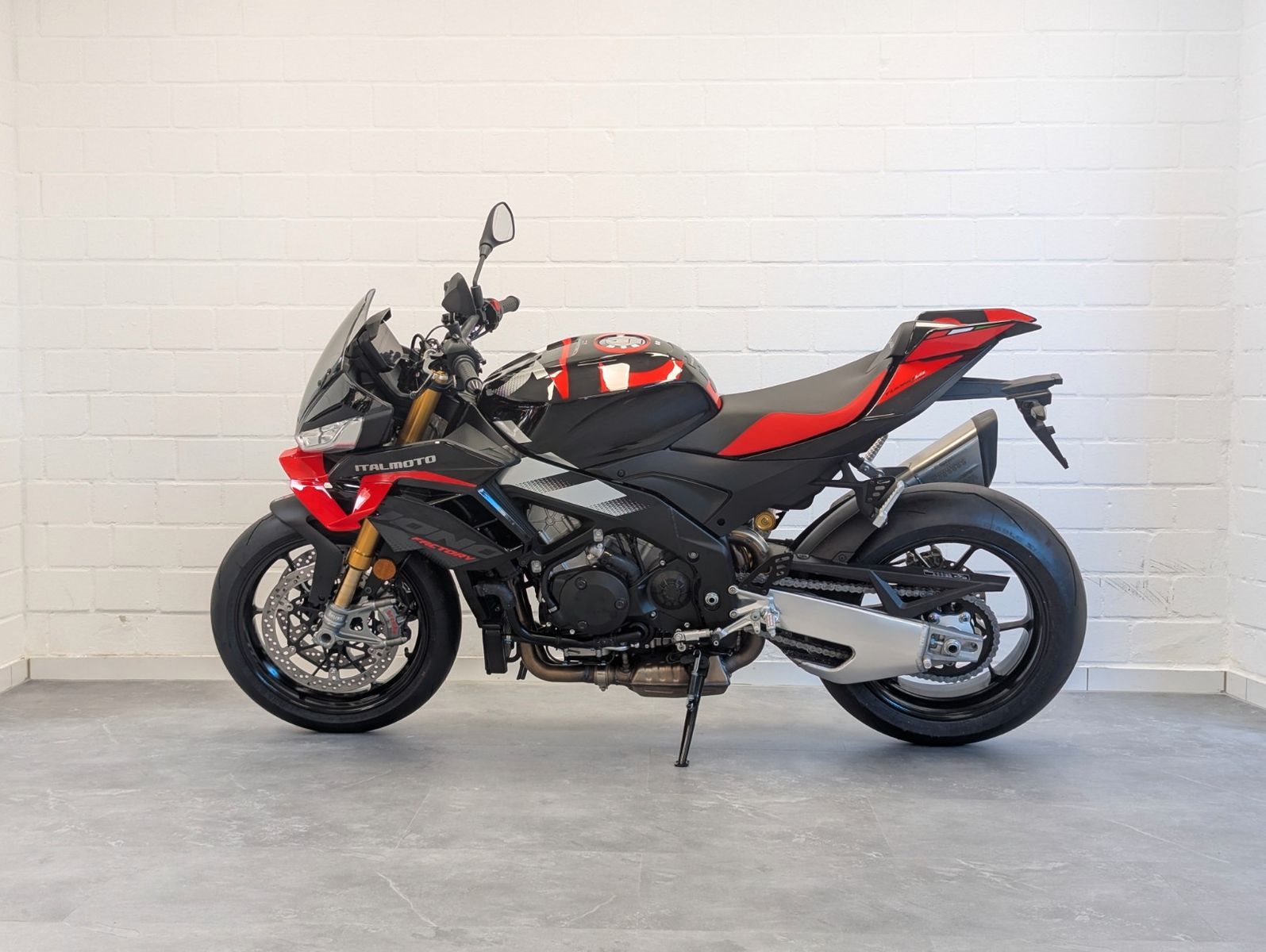 Die Aprilia Tuono V4 Factory präsentiert sich 2025 als ultimatives Naked-Bike mit beeindruckender Leistung und modernster Technologie. Der überarbeitete 65°-V4-Motor wurde von 1077 cm auf 1099 cm vergrößert und erfüllt die Euro 5+ Norm. Er leistet nun 180 PS bei 11.800 U/min und liefert ein maximales Drehmoment von 121 Nm bei 9.600 U/min.