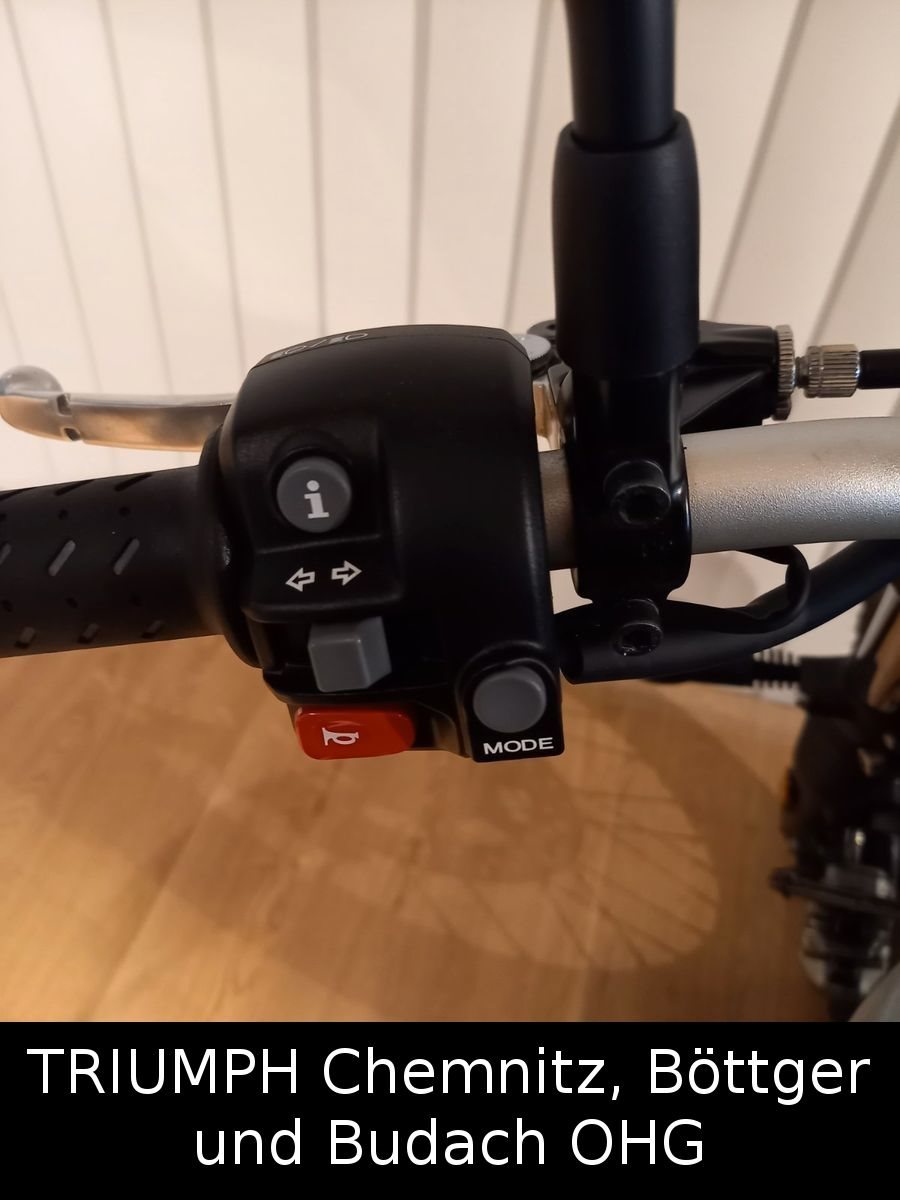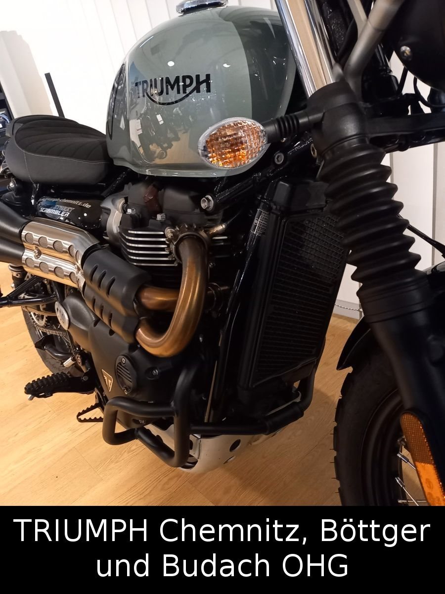 -Extras: Hauptständer, Motorschutzbügel, Alu Ölwannenschutz, Träger für Seitentasche links, foliertes großes Triumph-Triangel auf Tankoberseite