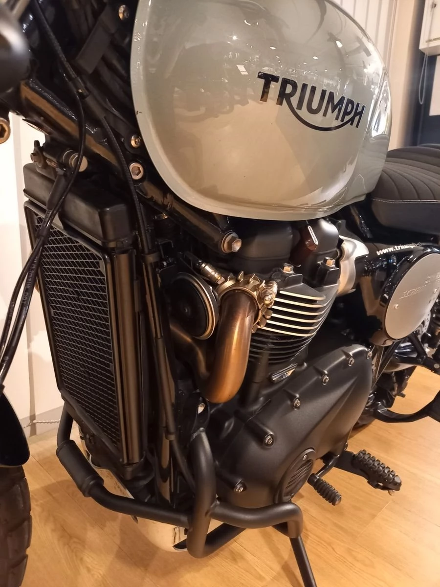 -Extras: Hauptständer, Motorschutzbügel, Alu Ölwannenschutz, Träger für Seitentasche links, foliertes großes Triumph-Triangel auf Tankoberseite