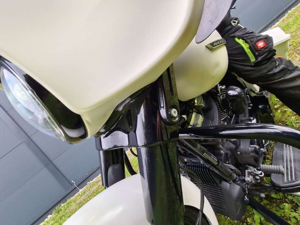 Frontgabel, Felgen, Abdeckungen und zahlreiche Anbauteile in schwarz lackiert