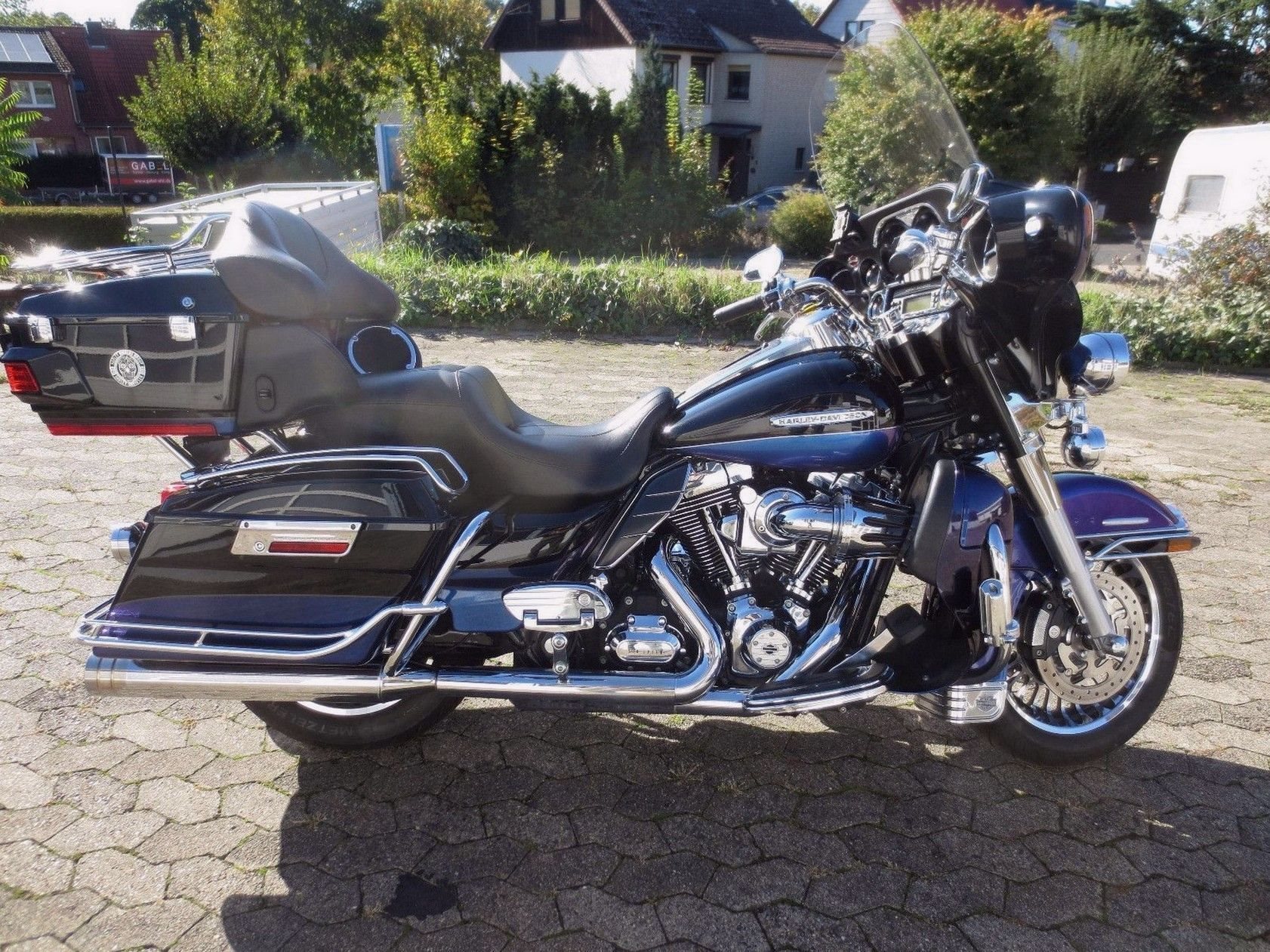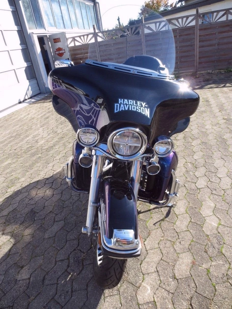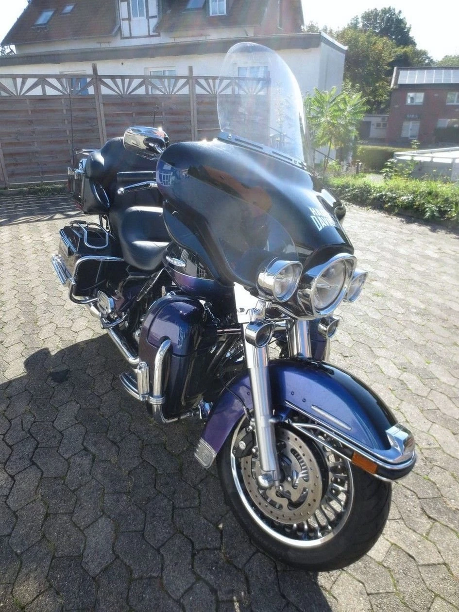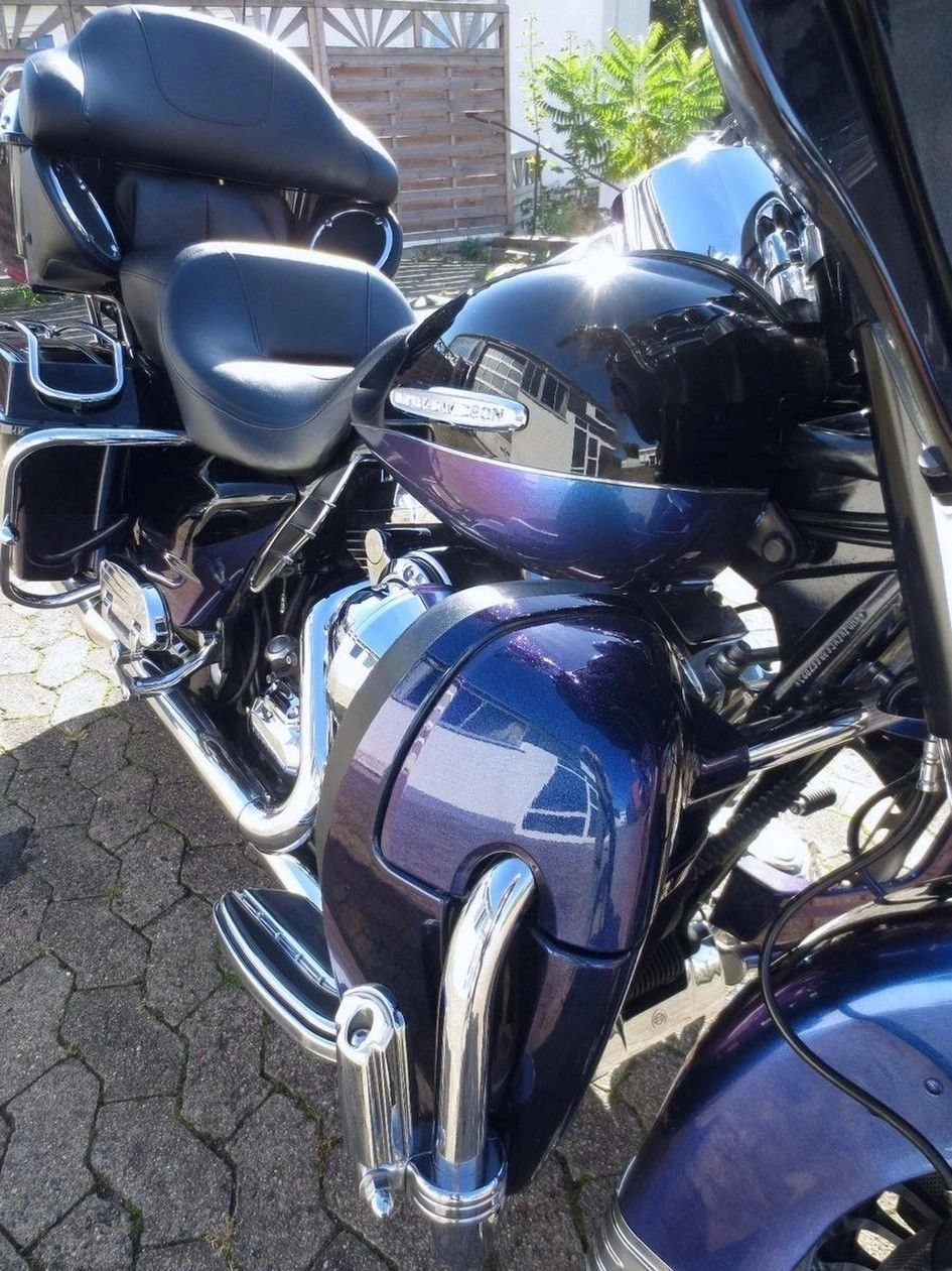 Super gepflegte E-Glide Ultra Limited in schwarz/blau an. Metallic-Lackierung, die im Sonnnlicht changiert über verschiedene Blau- und Violett-Töne. Der Vorbesitzer und ich haben dieses Motorrad mit allem ausgestattet, was Harley an Zubehör zu bieten hat, u.a.: