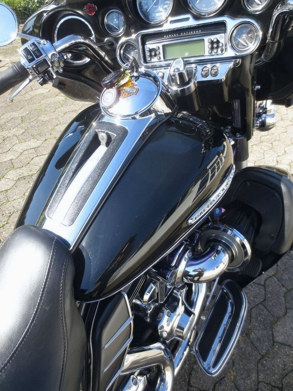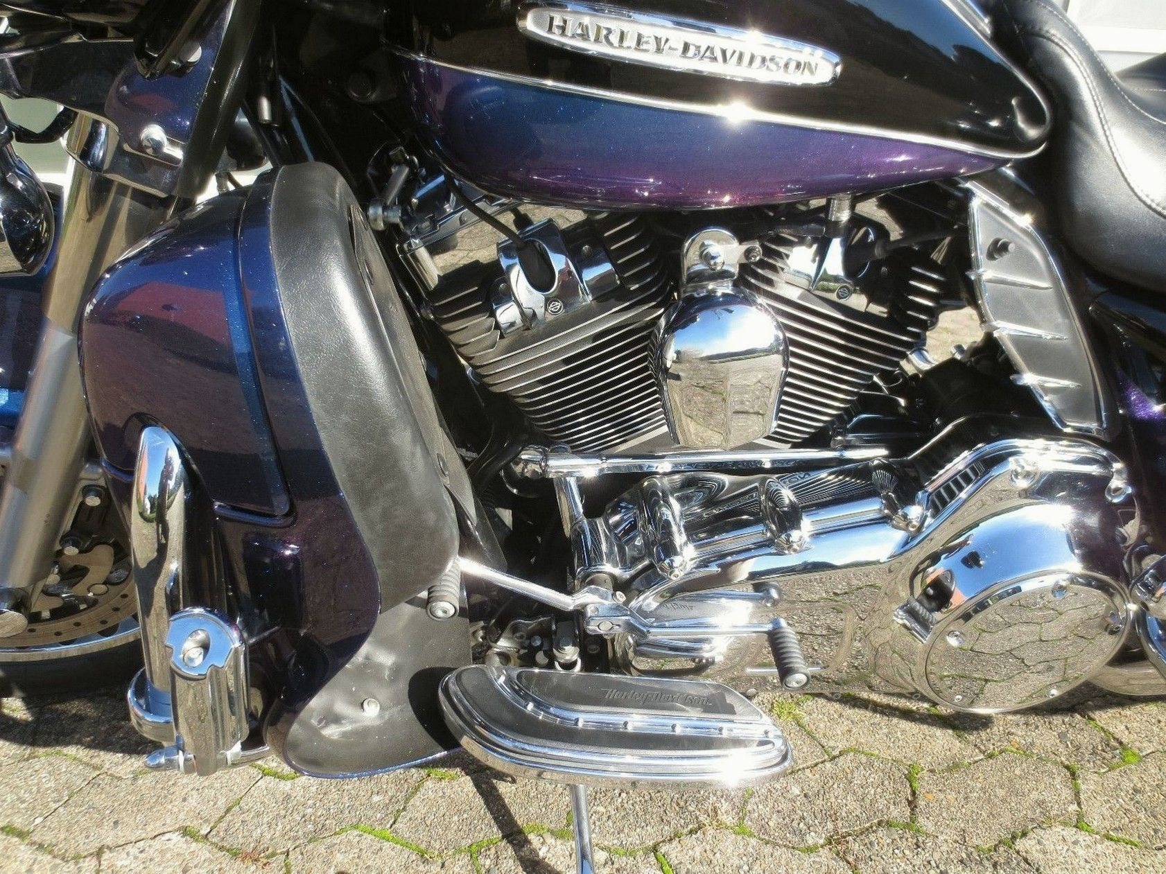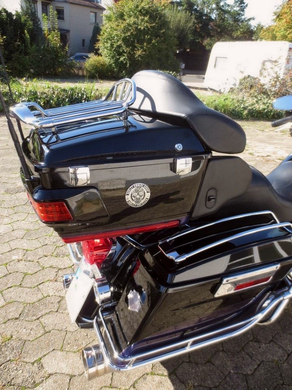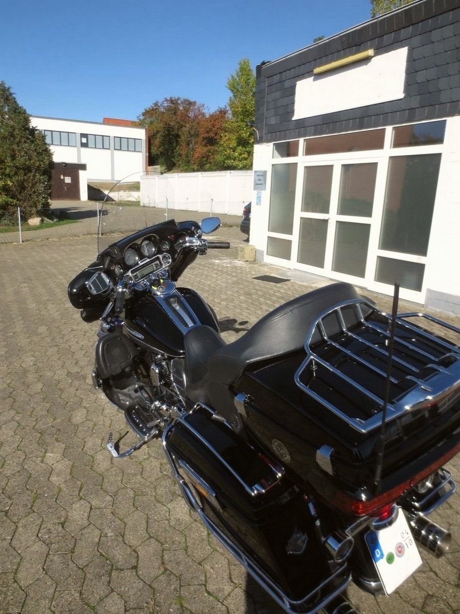 Super gepflegte E-Glide Ultra Limited in schwarz/blau an. Metallic-Lackierung, die im Sonnnlicht changiert über verschiedene Blau- und Violett-Töne. Der Vorbesitzer und ich haben dieses Motorrad mit allem ausgestattet, was Harley an Zubehör zu bieten hat, u.a.: