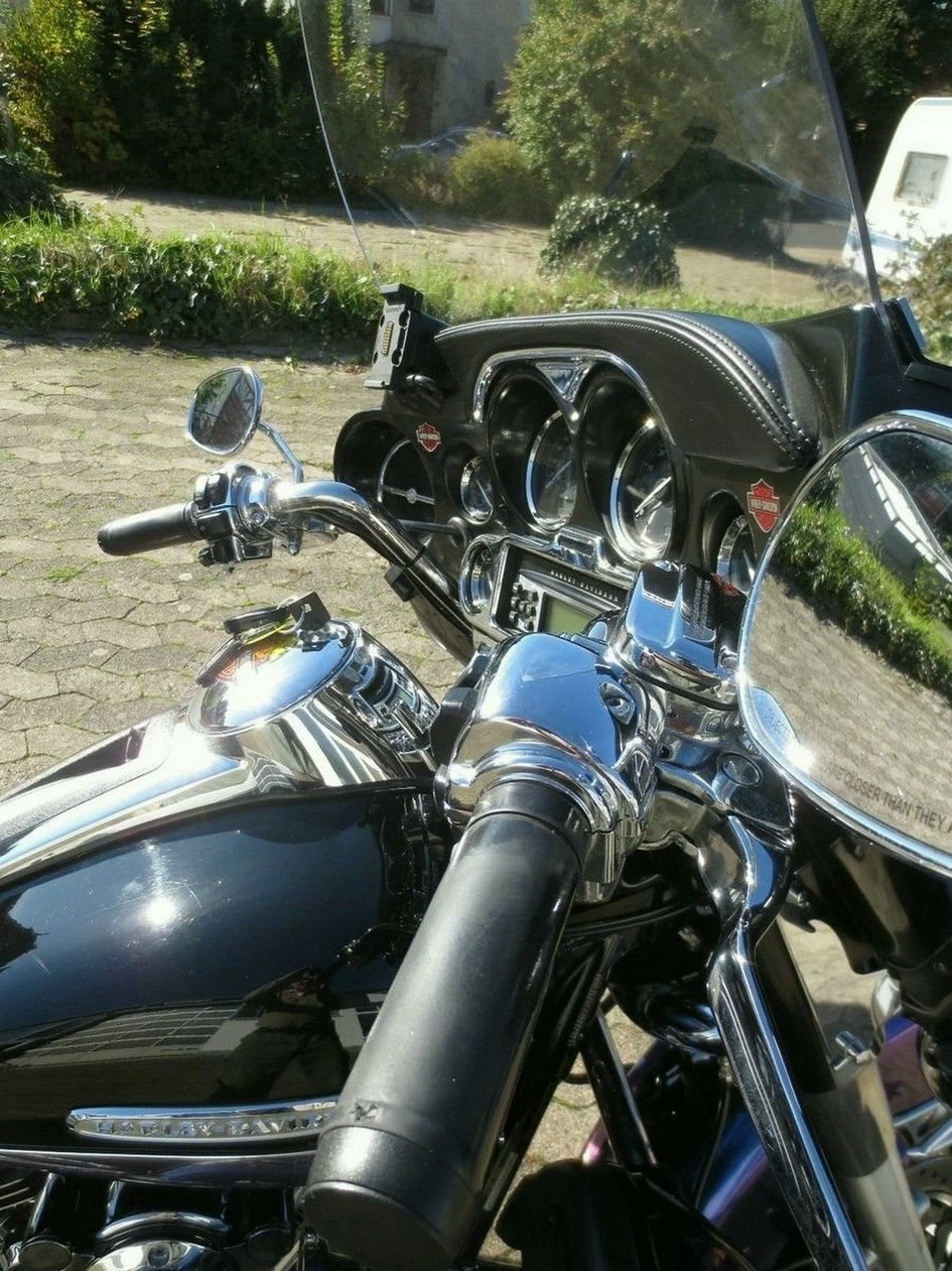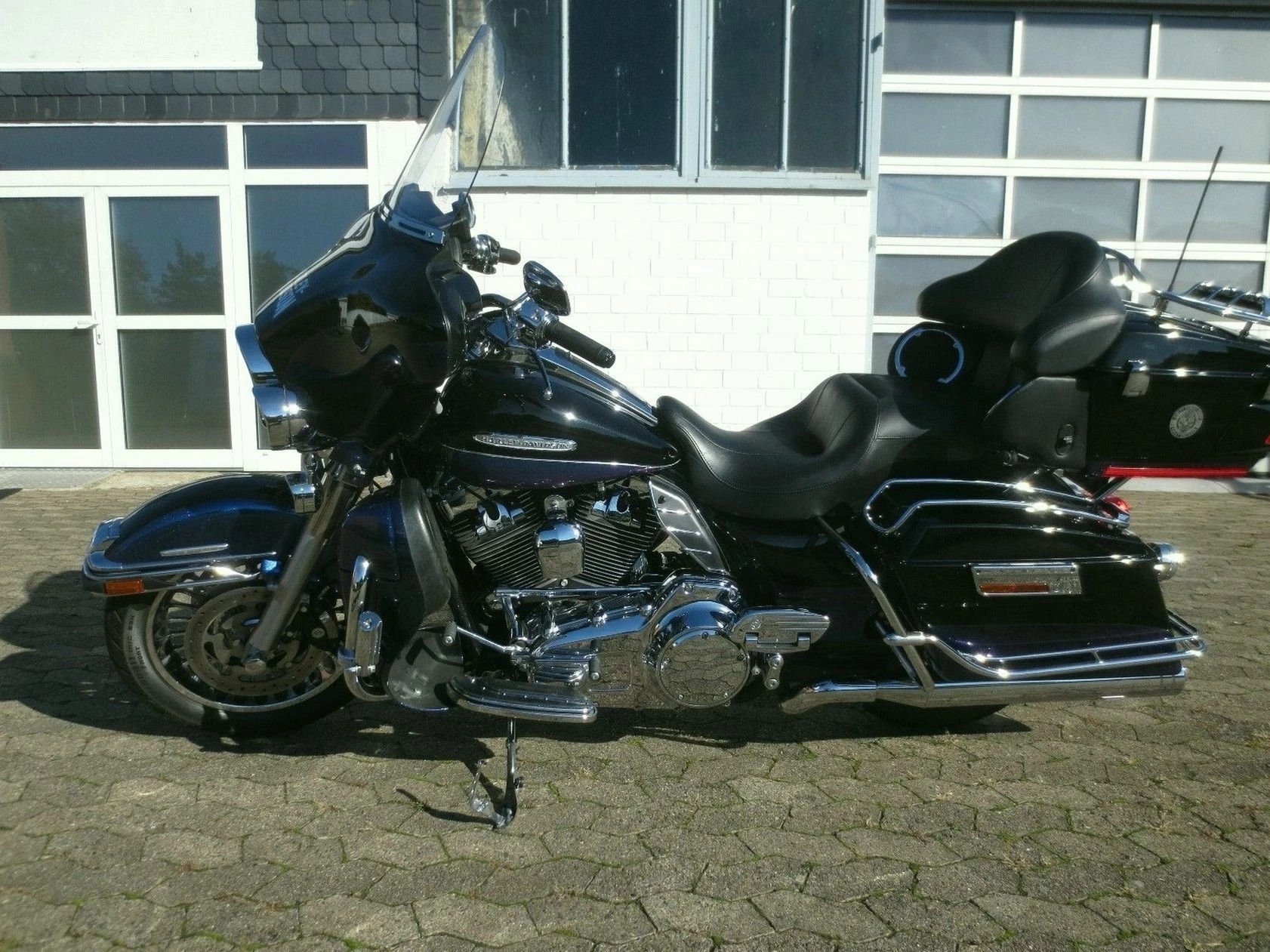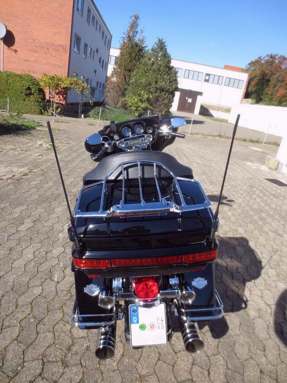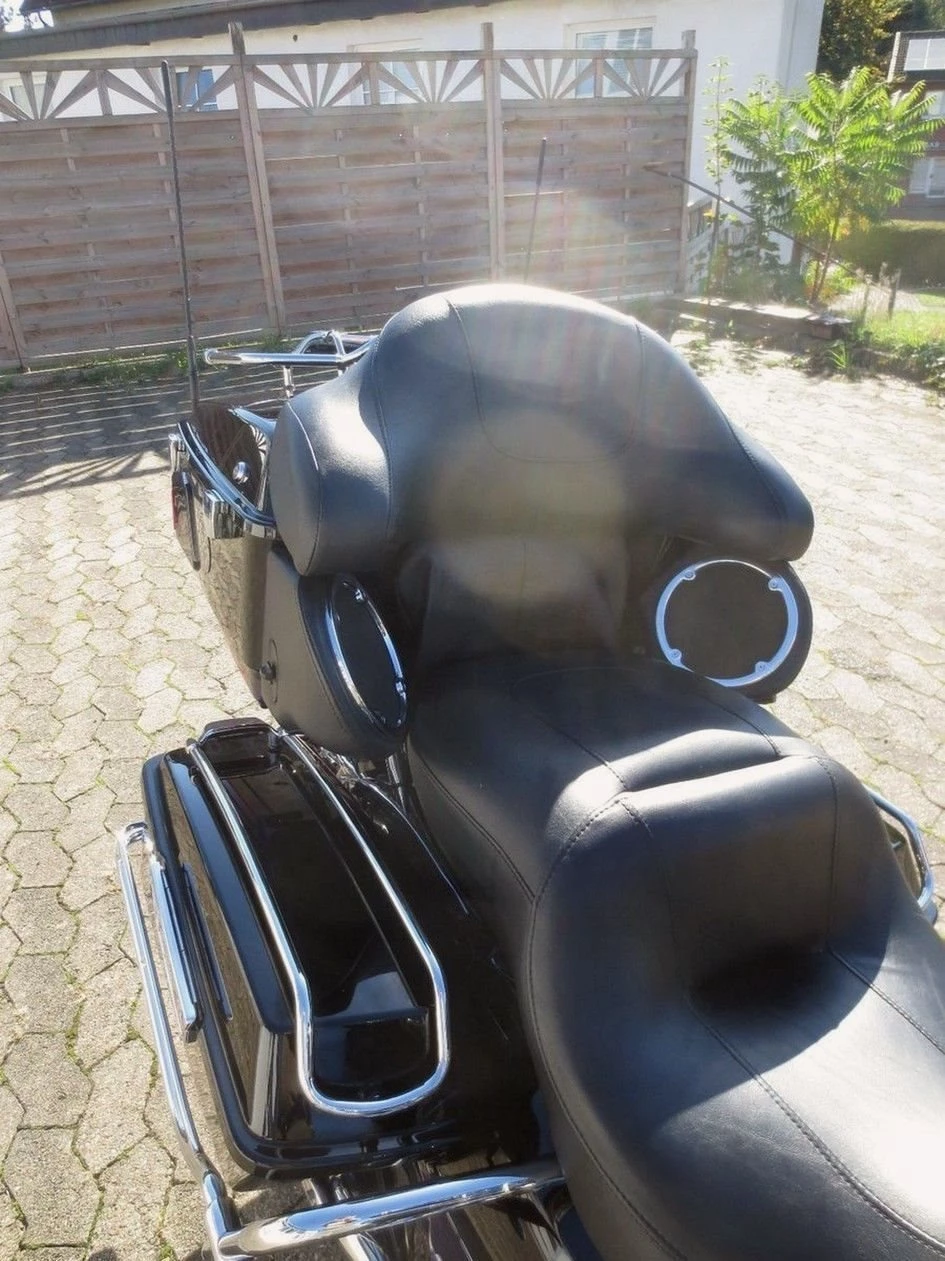 Super gepflegte E-Glide Ultra Limited in schwarz/blau an. Metallic-Lackierung, die im Sonnnlicht changiert über verschiedene Blau- und Violett-Töne. Der Vorbesitzer und ich haben dieses Motorrad mit allem ausgestattet, was Harley an Zubehör zu bieten hat, u.a.:
