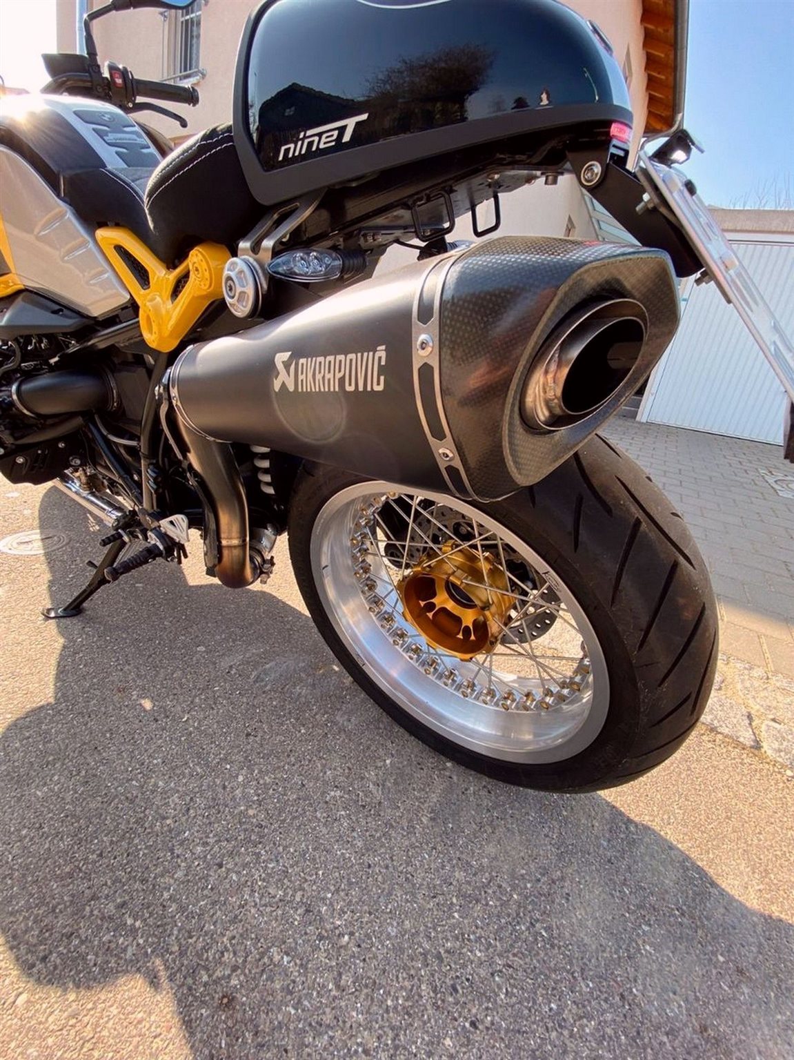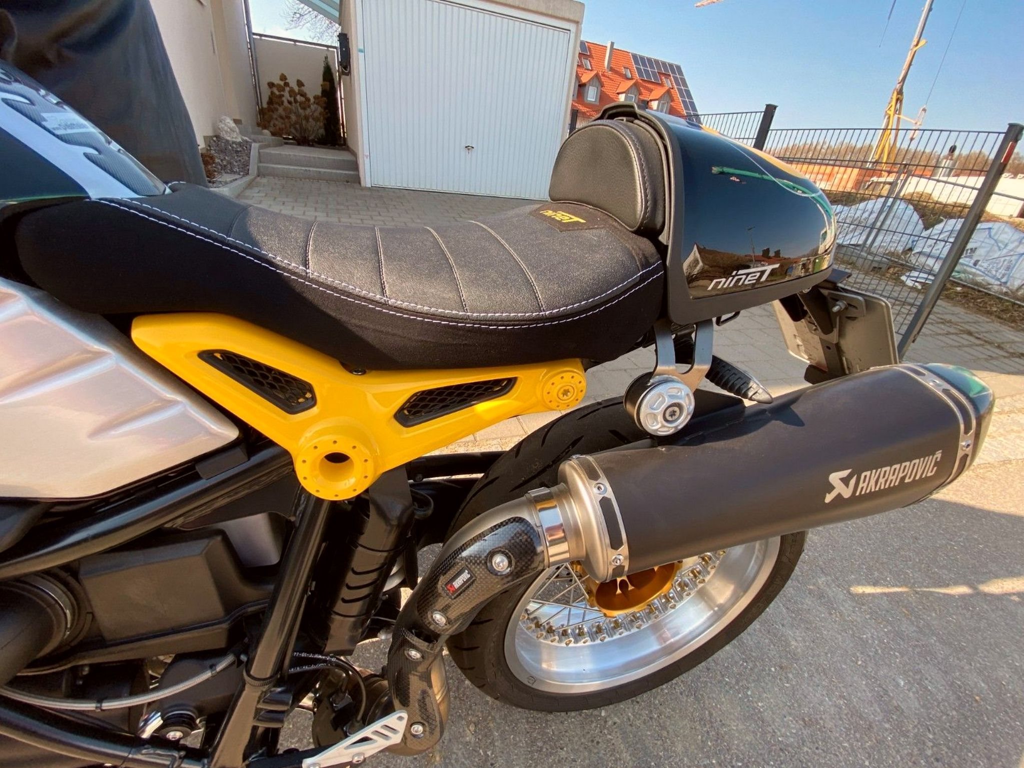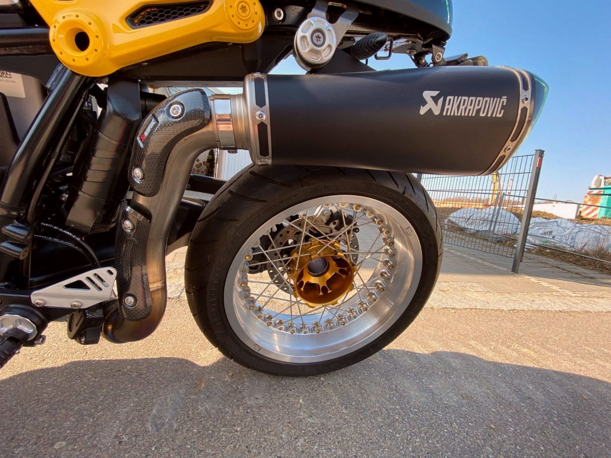 Es wurden andere Speichenfelgen verbaut, andere Fußrasteranlage, Sitzbank wurde neu überzogen und auch weicher gemacht, Akrapovic Auspuffanlage.