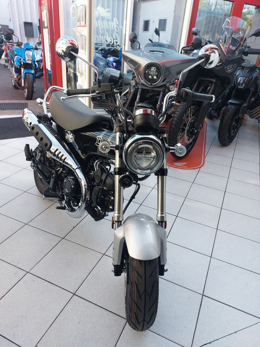 Honda ST125 Dax, Neufahrzeug mit Tageszulassung 11/2025, Modell 2025, schwarz, ABS (nur vorne), 4 Gang Fußschaltung, Halbautomatik, Gewicht vollgetankt 107 kg, 2 Sitzplätze, Kraftstoffverbrauch nach WMTC 1,5 l/100km, CO2 Ausstoss 35g/km, Euro 5+.