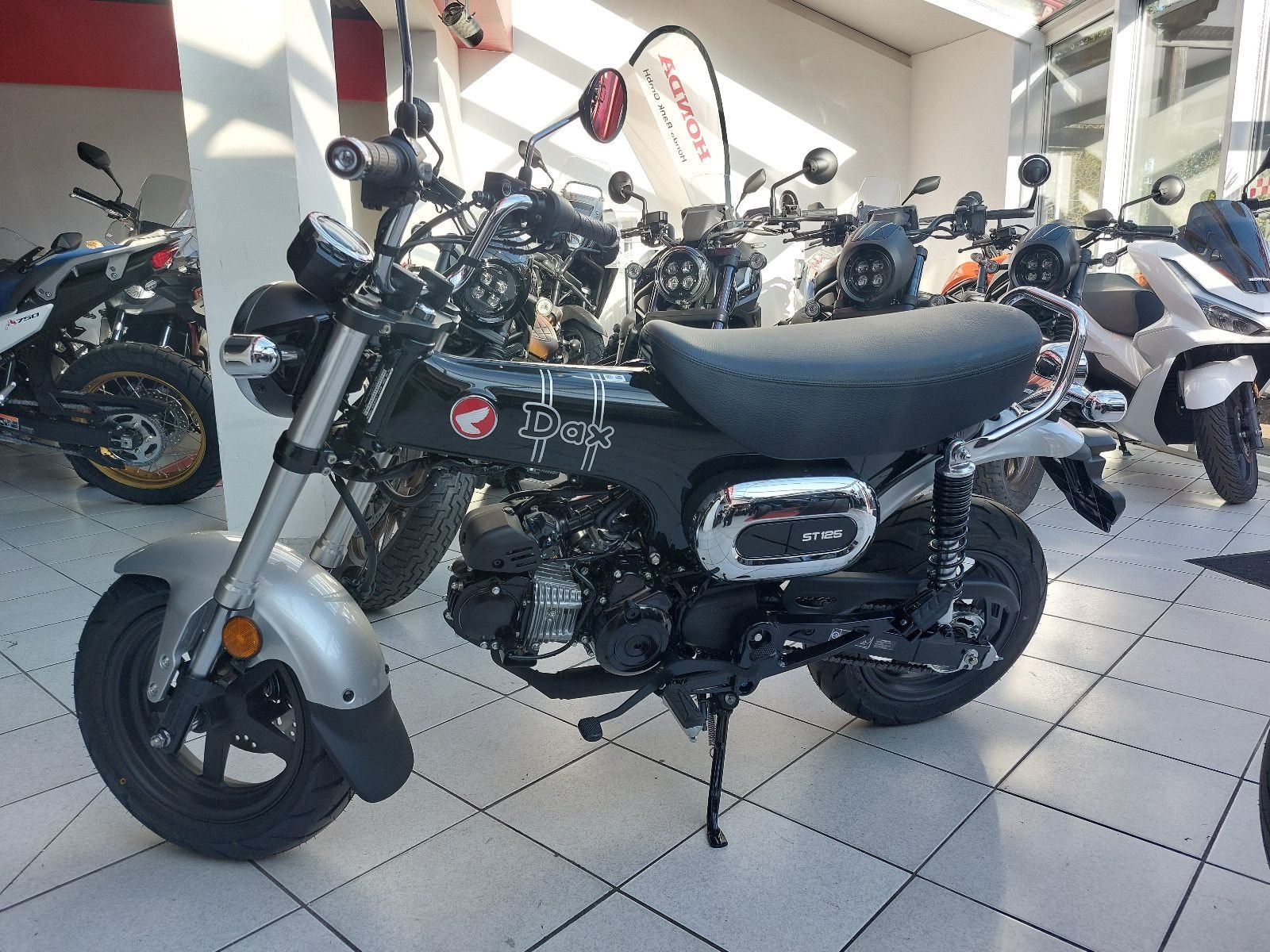 Honda ST125 Dax, Neufahrzeug mit Tageszulassung 11/2025, Modell 2025, schwarz, ABS (nur vorne), 4 Gang Fußschaltung, Halbautomatik, Gewicht vollgetankt 107 kg, 2 Sitzplätze, Kraftstoffverbrauch nach WMTC 1,5 l/100km, CO2 Ausstoss 35g/km
