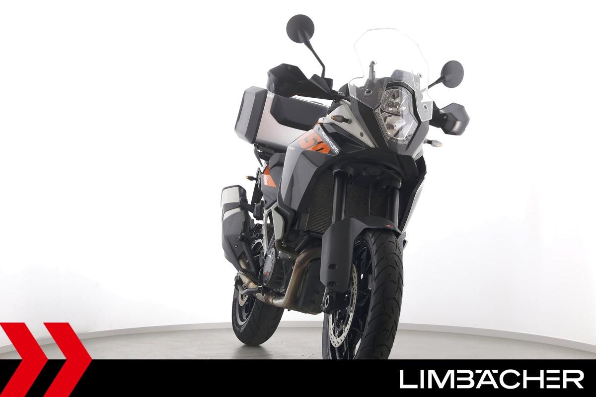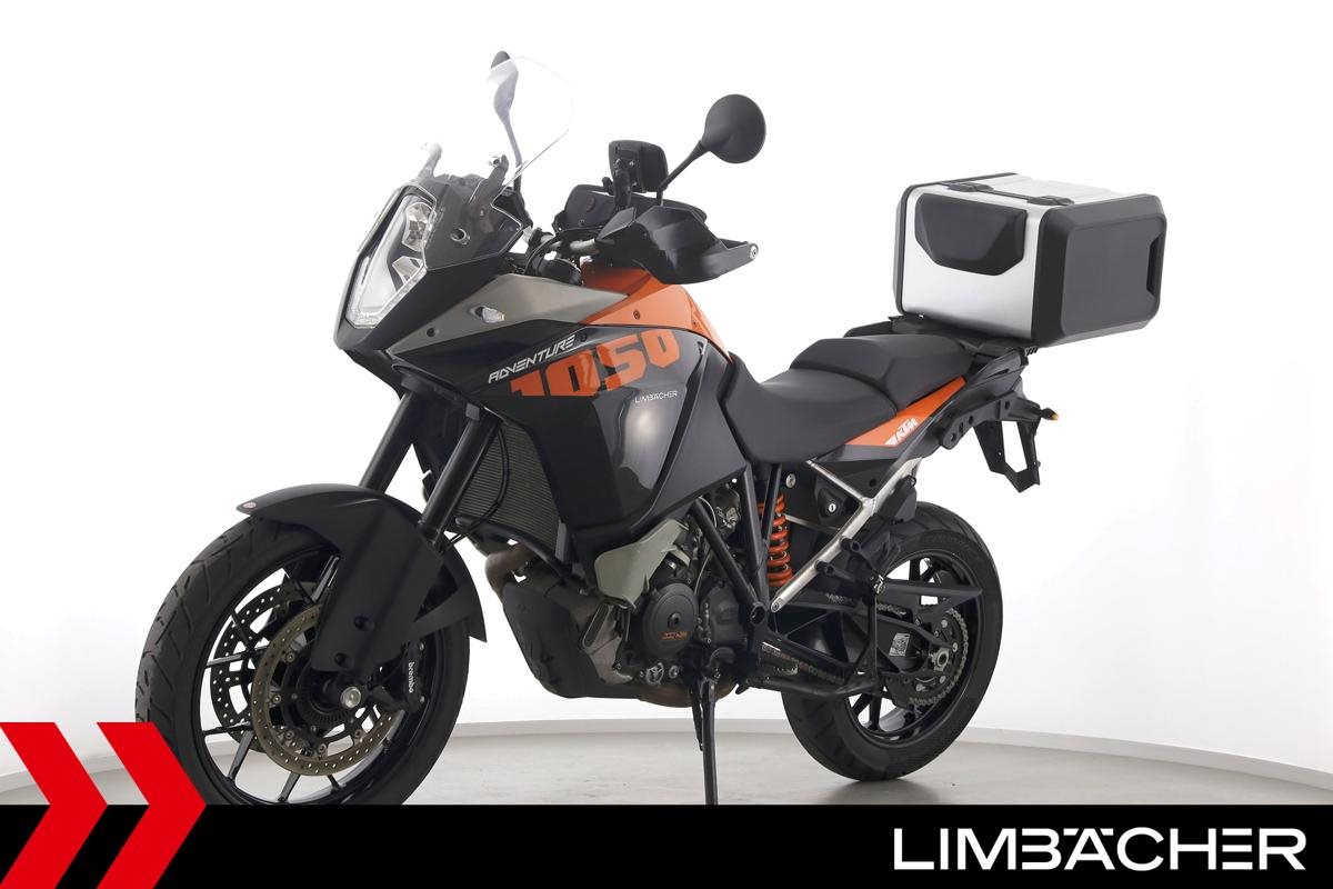 Eine KTM 1050 Adventure in gepflegtem Zustand u.a. mit KTM-Topcase und Tankrucksack.