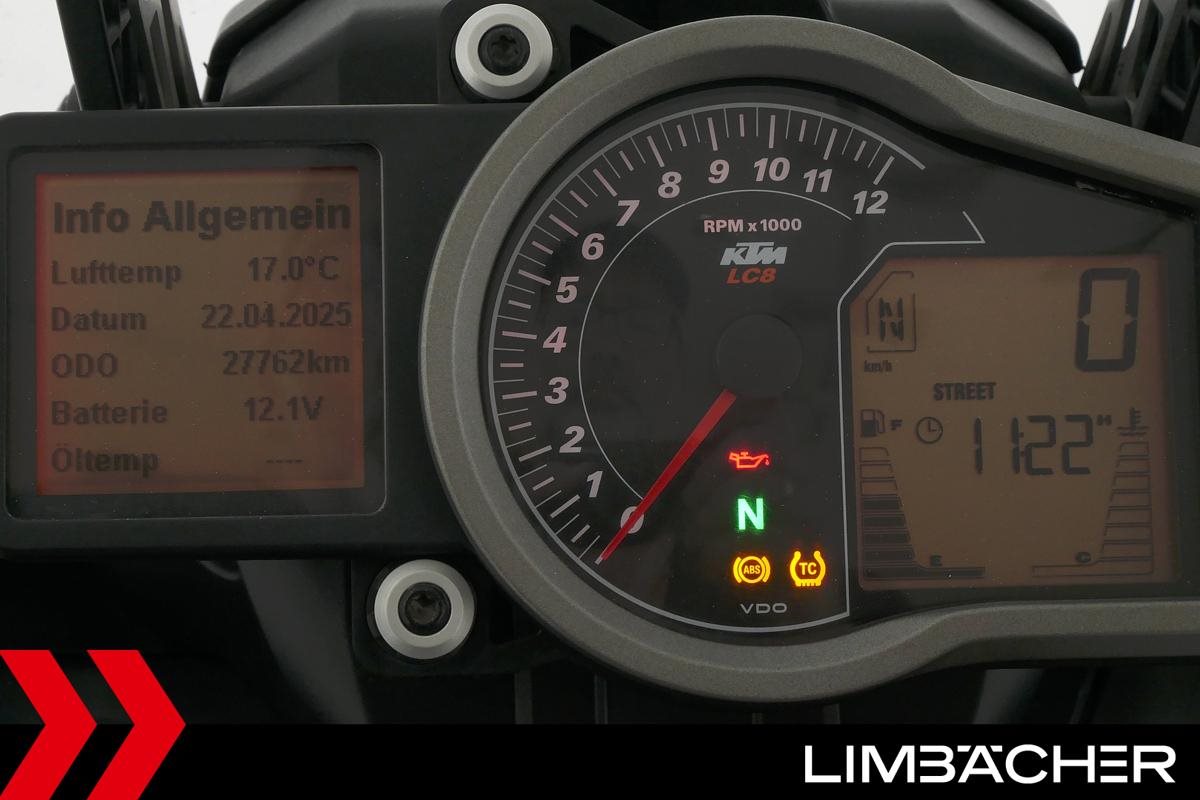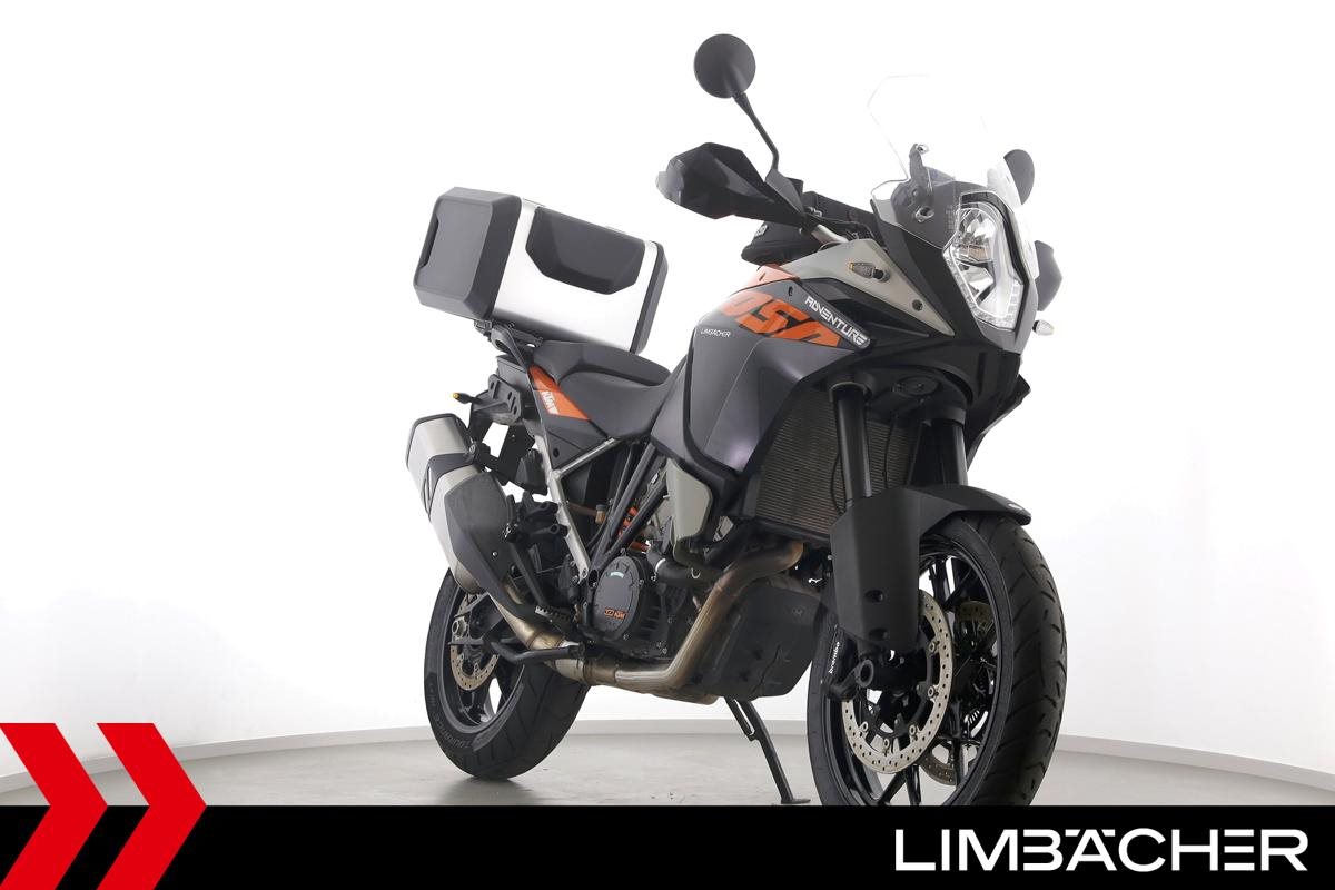 Eine KTM 1050 Adventure in gepflegtem Zustand u.a. mit KTM-Topcase und Tankrucksack.