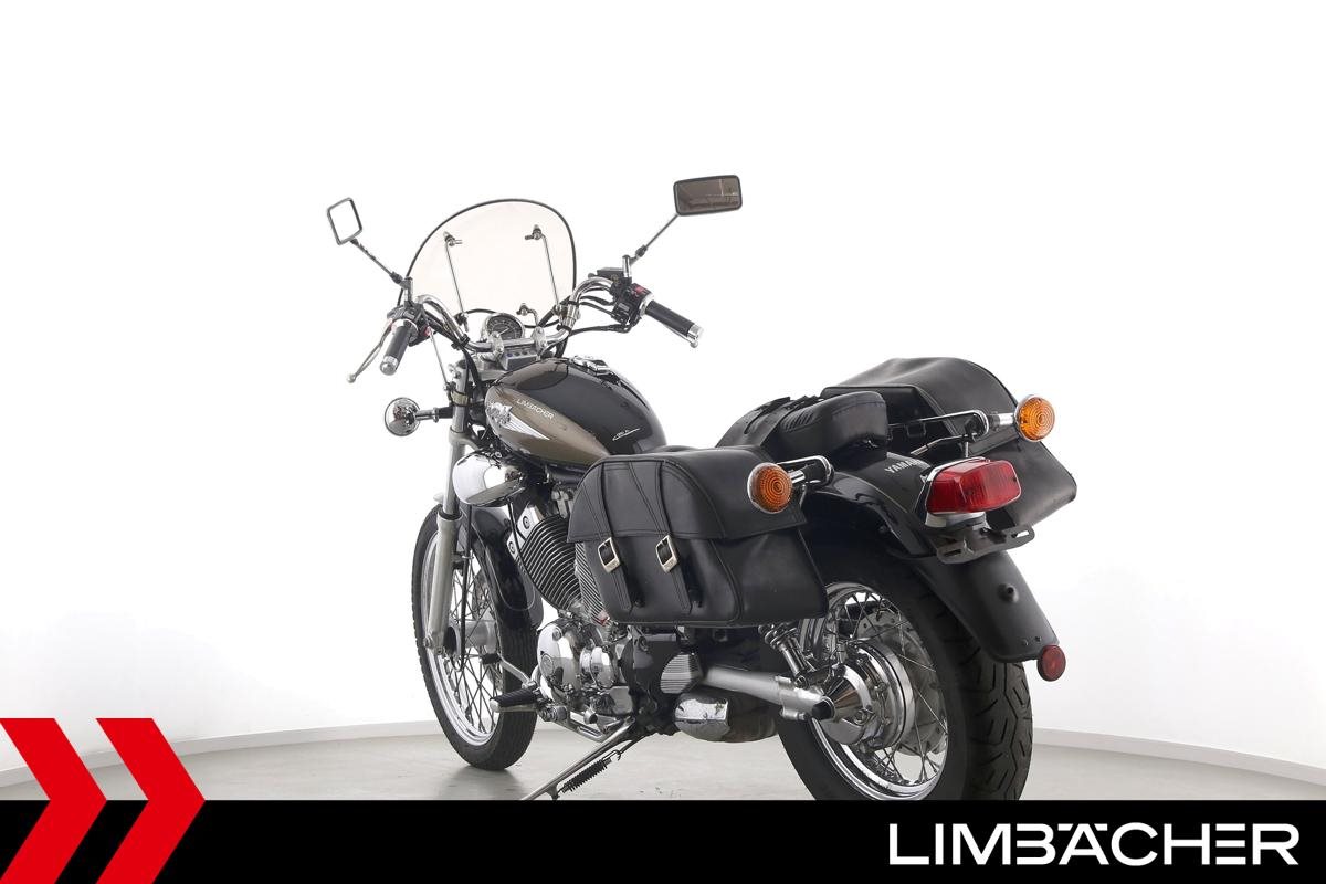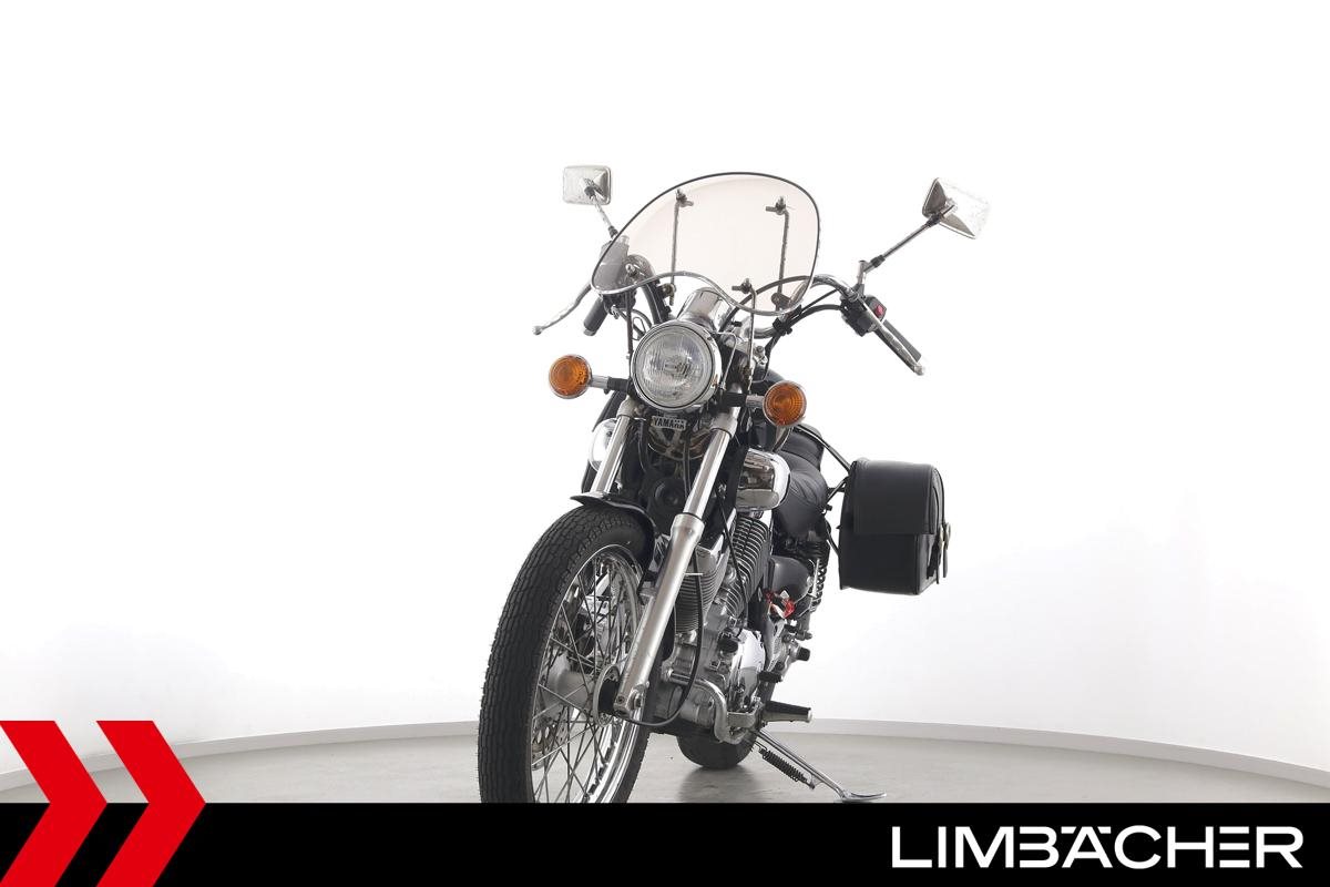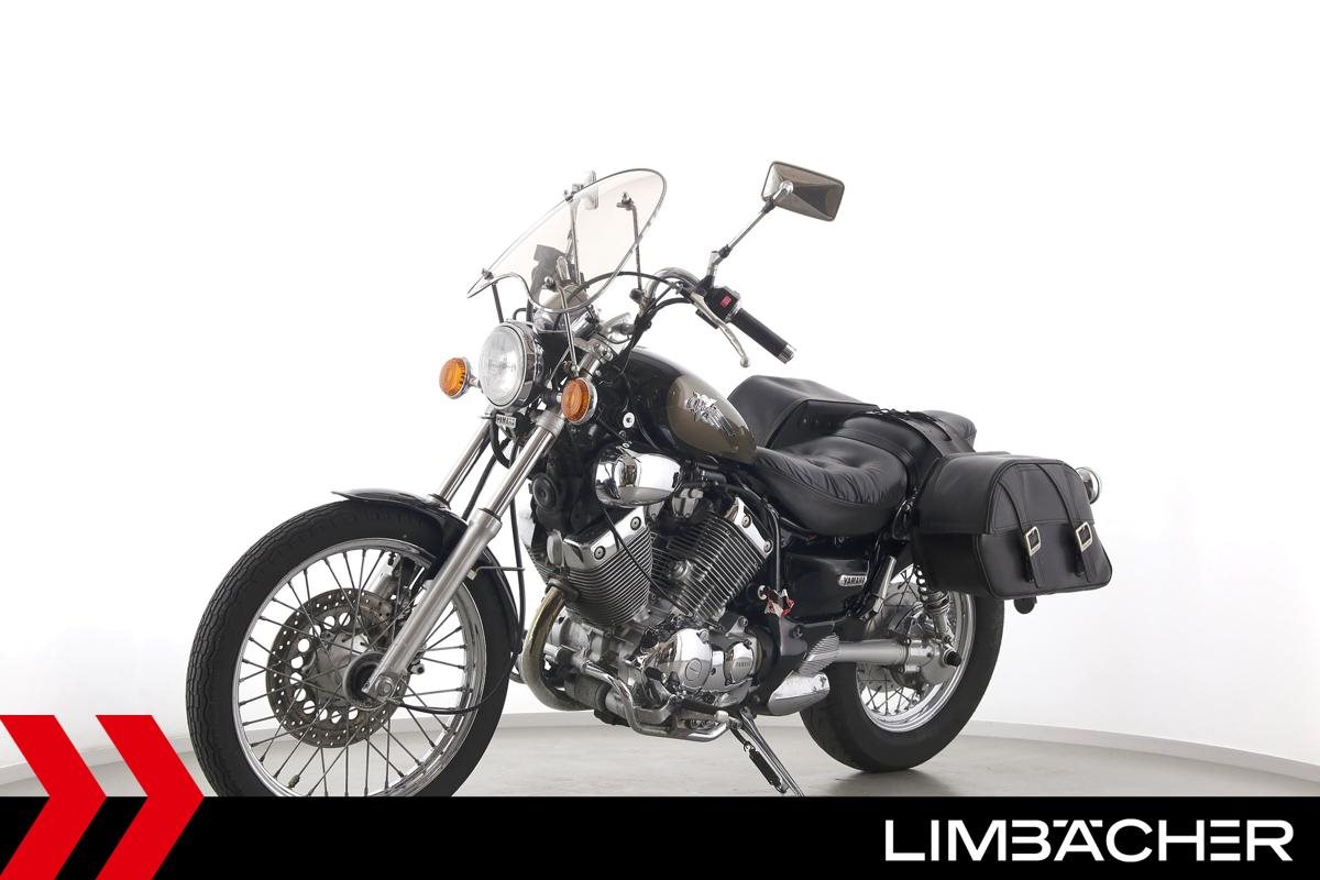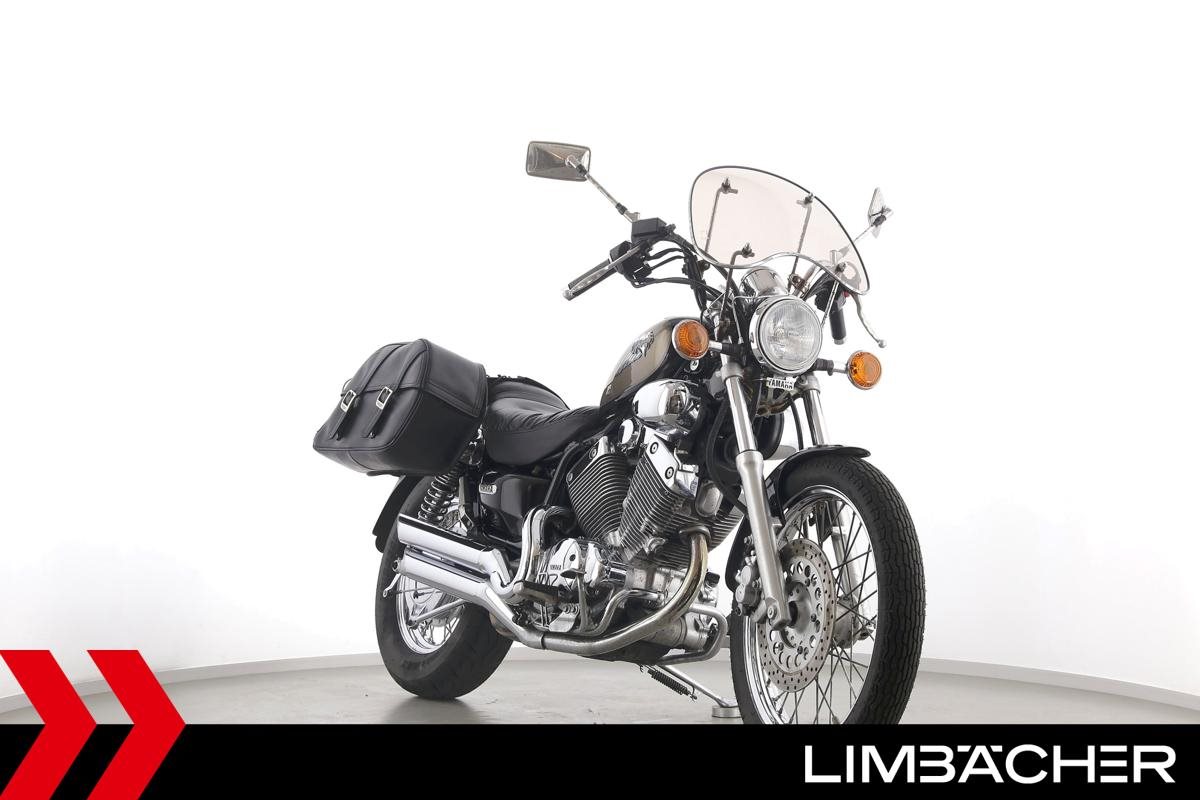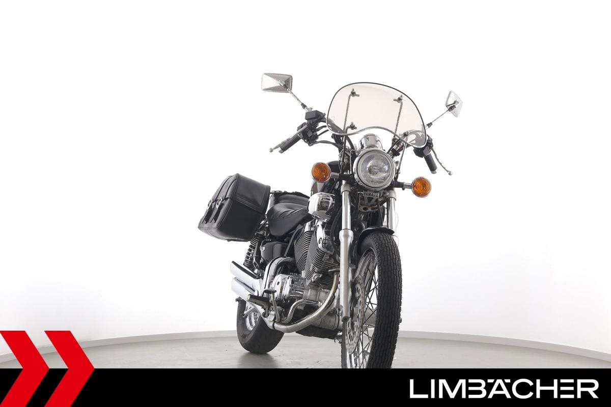 Eine Yamaha XV 535 Virago in gebrauchtem Zustand mit Windschild und Satteltaschen.