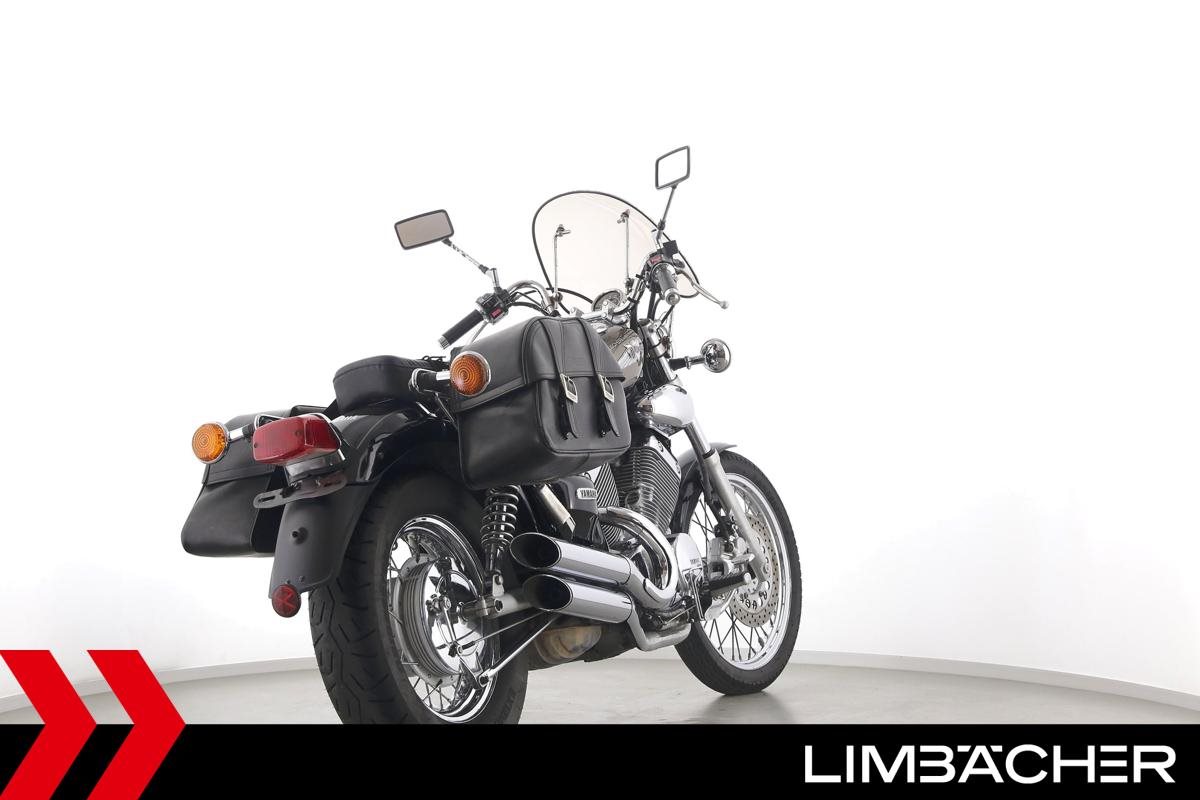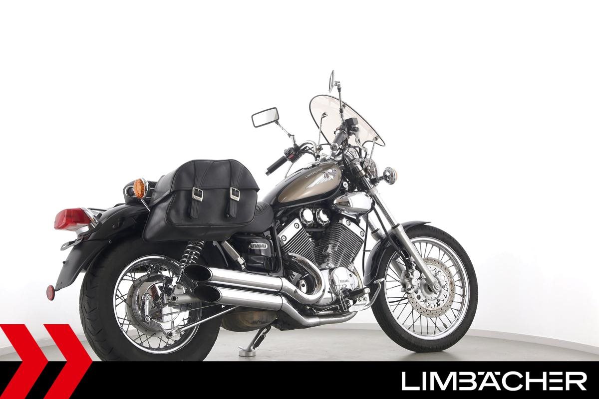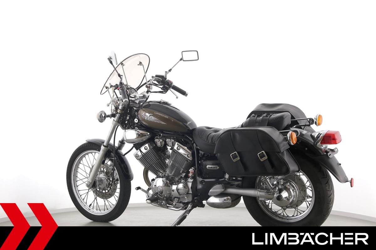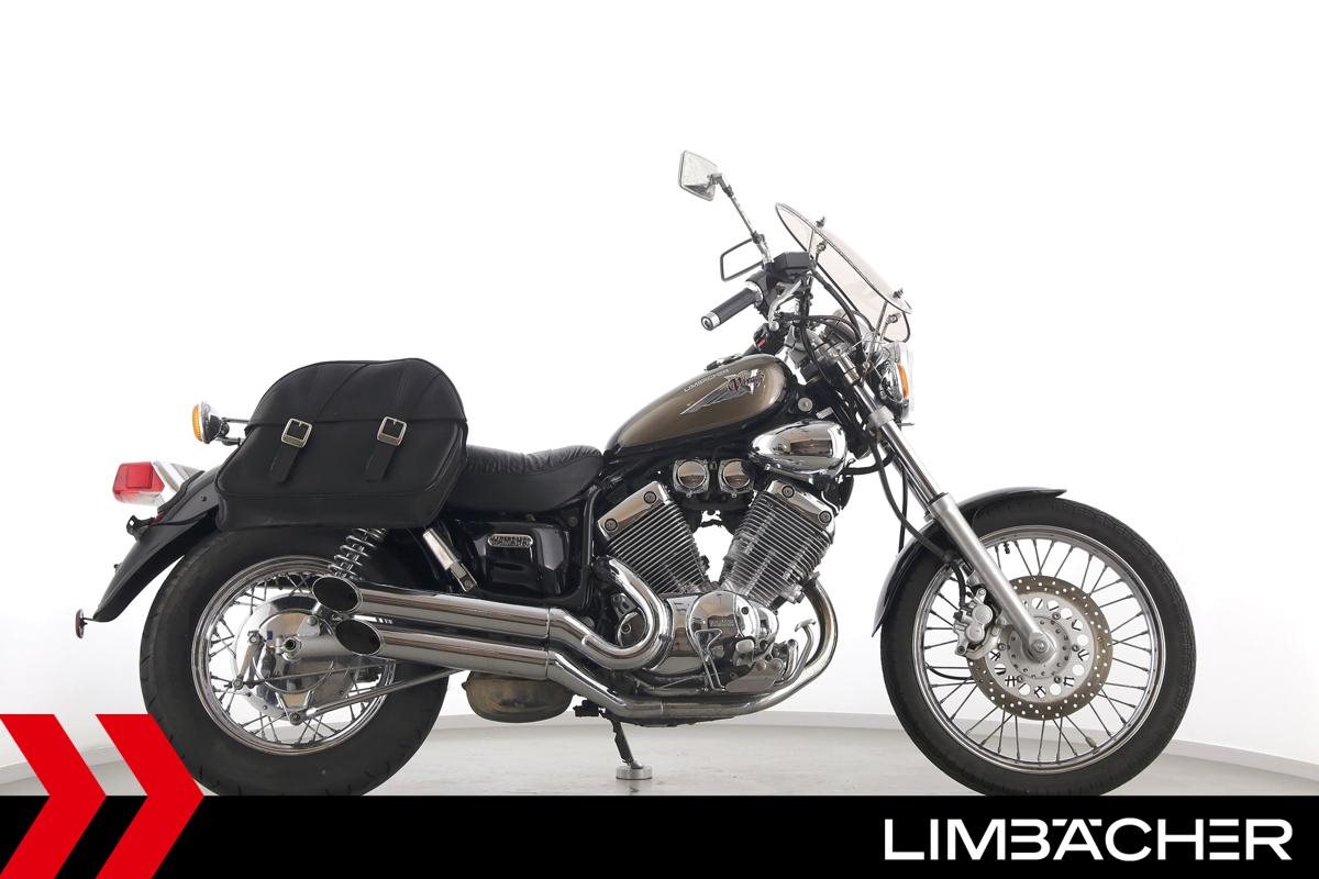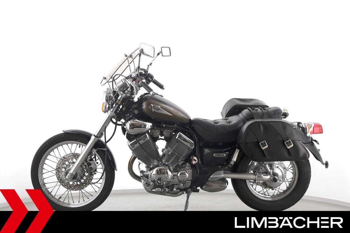Eine Yamaha XV 535 Virago in gebrauchtem Zustand mit Windschild und Satteltaschen.