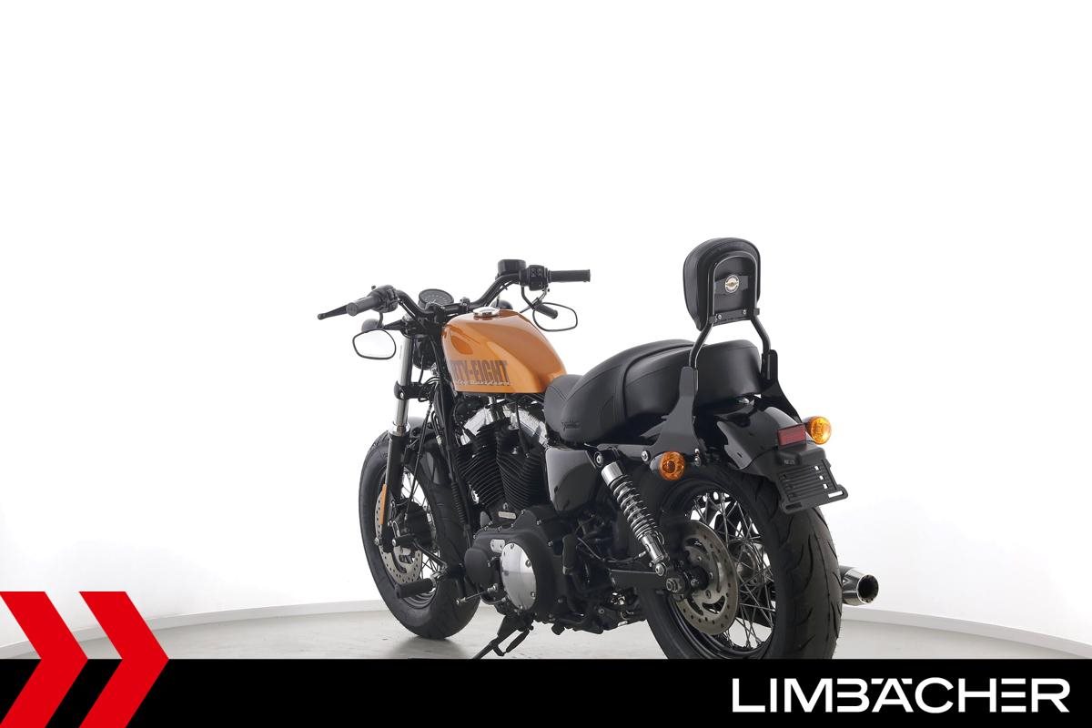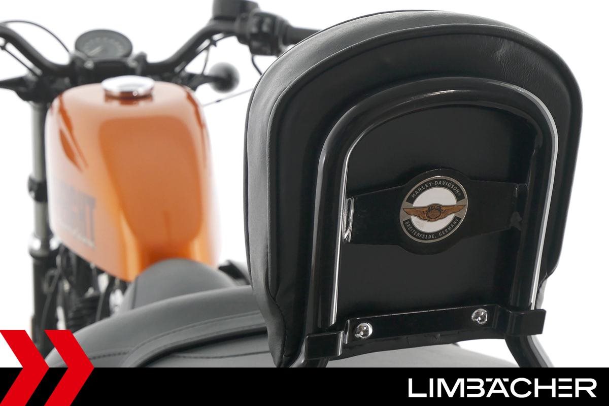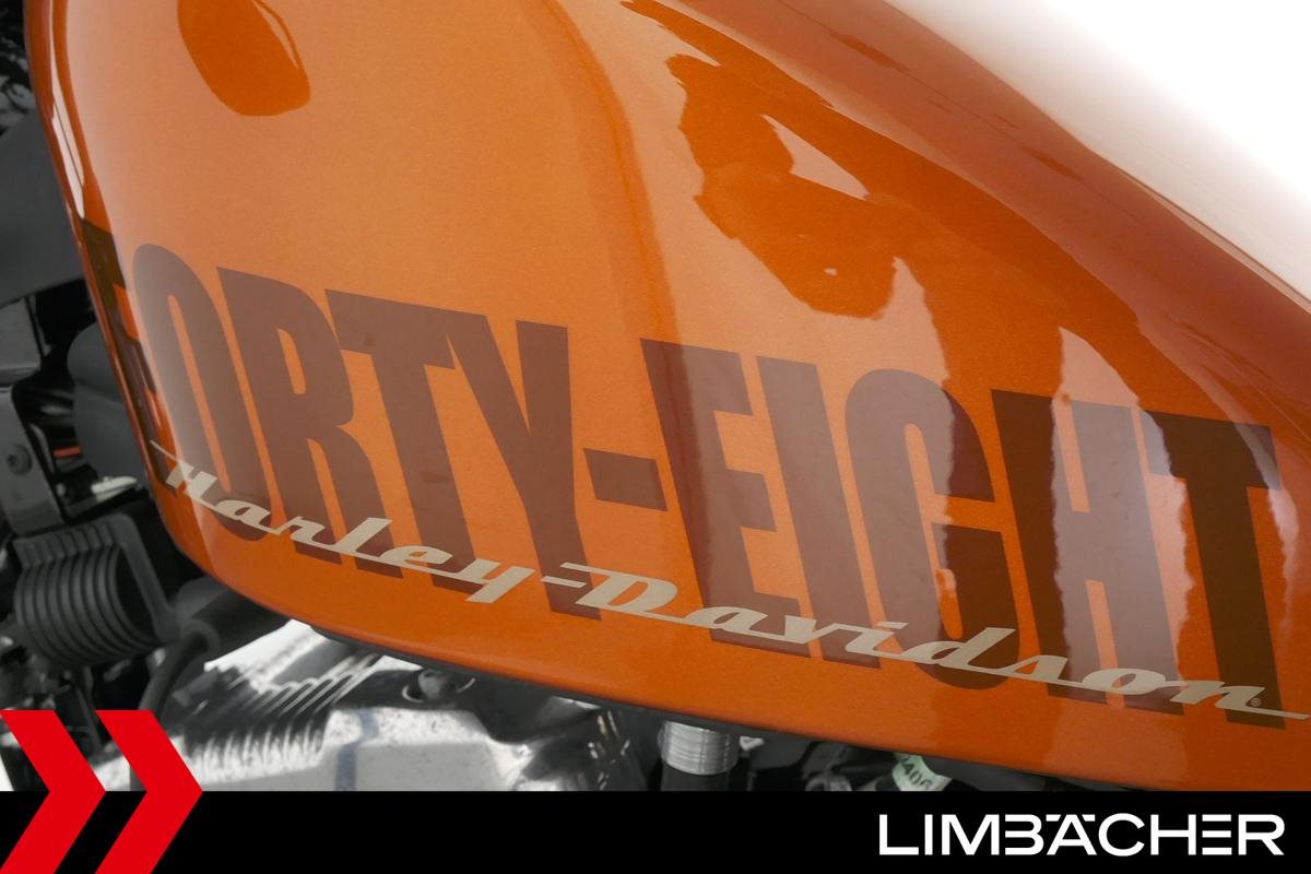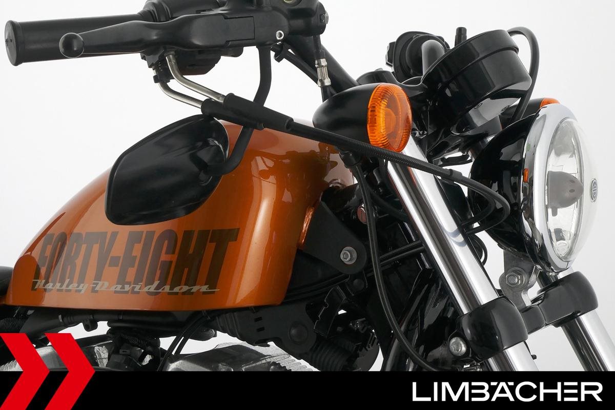 Eine Harley-Davidson Sportster XL 1200 X Forty Eight aus erster Hand in gepflegtem Zustand u.a. mit Miller-Endschalldämpfer und Komfort-Doppelsitzbank.