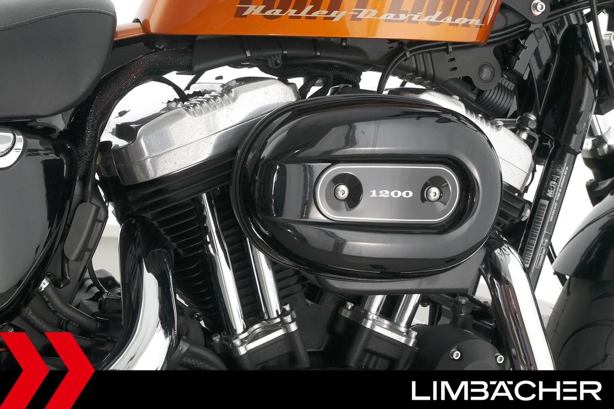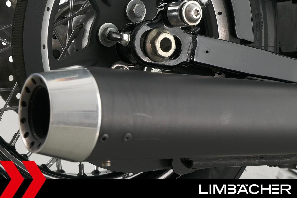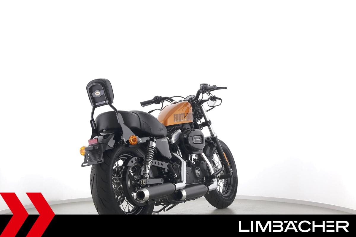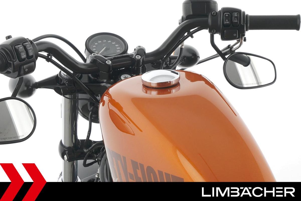 Eine Harley-Davidson Sportster XL 1200 X Forty Eight aus erster Hand in gepflegtem Zustand u.a. mit Miller-Endschalldämpfer und Komfort-Doppelsitzbank.