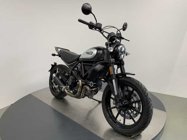 Schöne Ducati Scrambler 800 Icon Dark mit Sportauspuff, Gepäckbrücke von Hepco&Becker, und Lenkerstrebe.