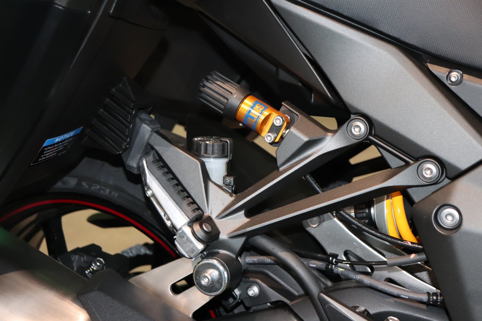 S46-Federbein von Öhlins, Brembo-Bremsanlage, Stahlflex-Leitungen und Heizgriffe.