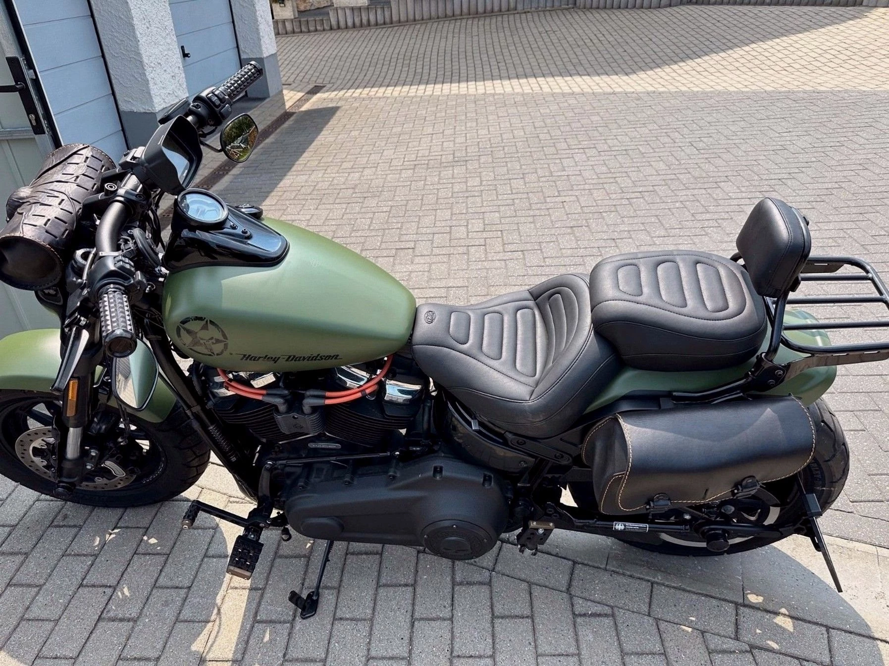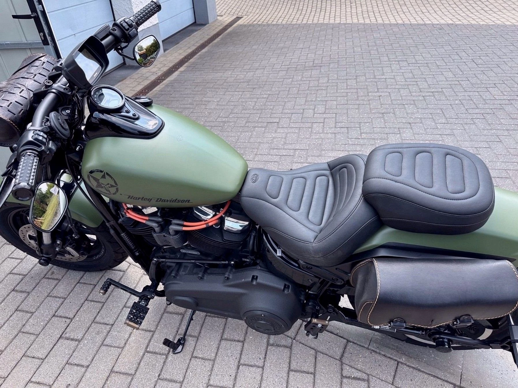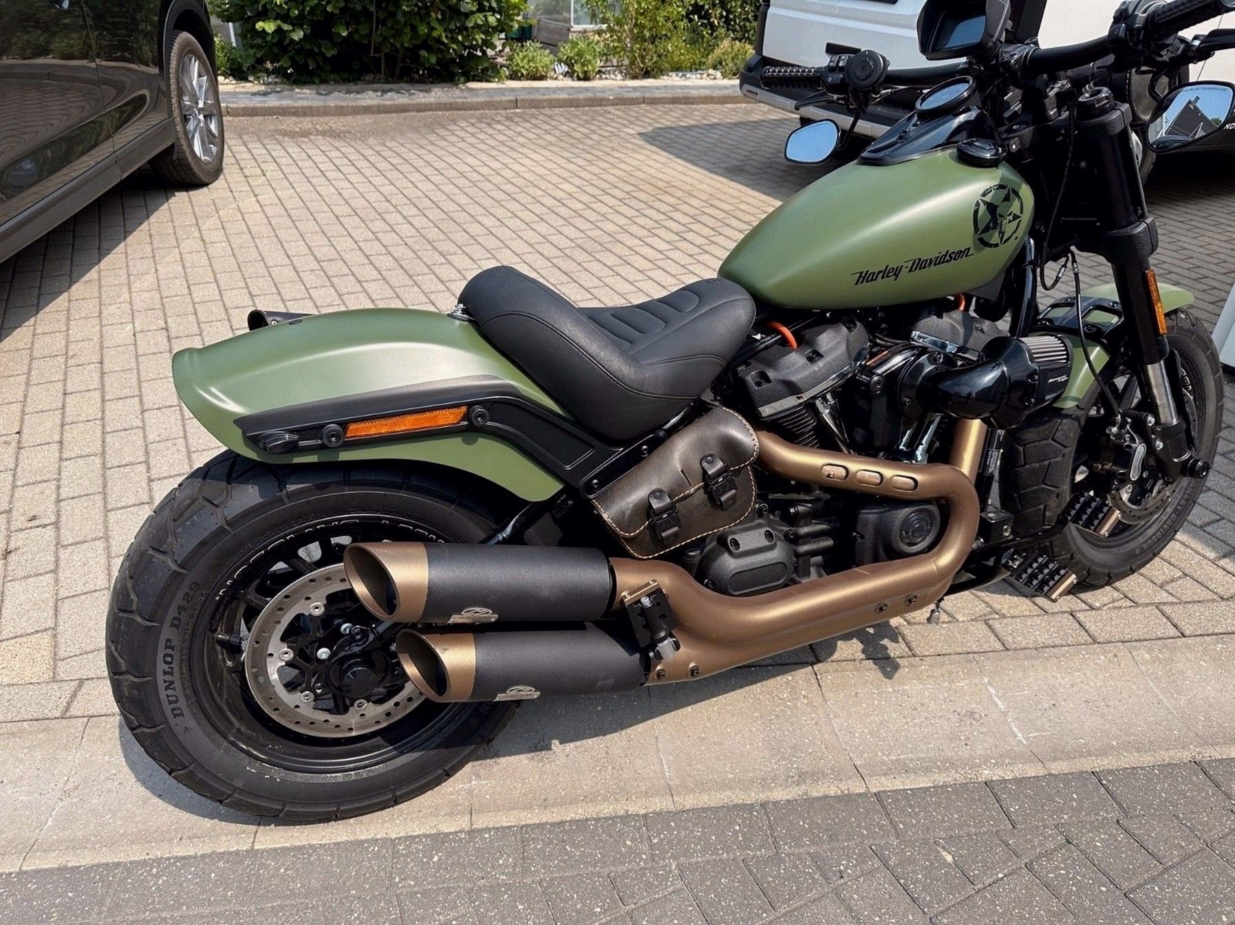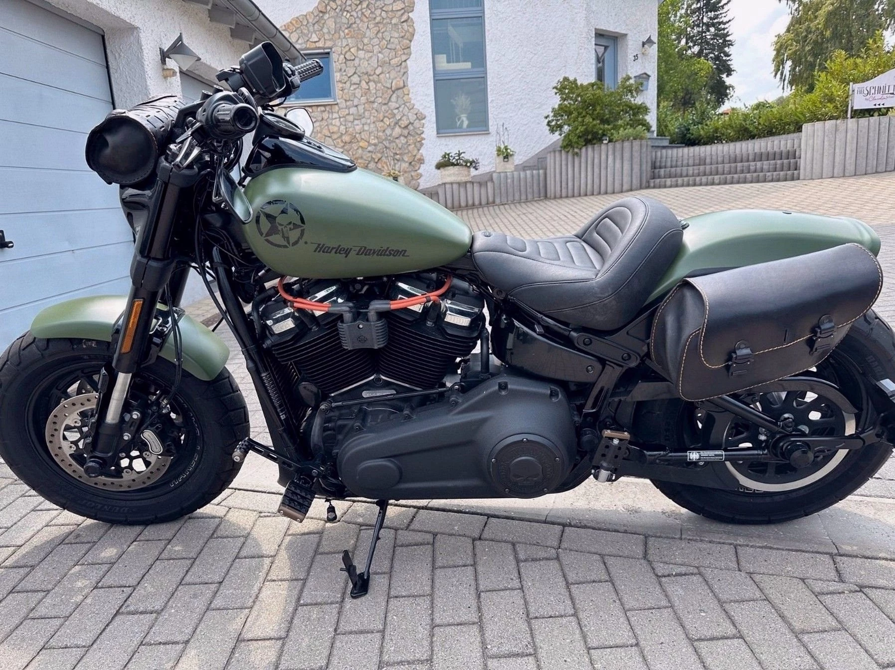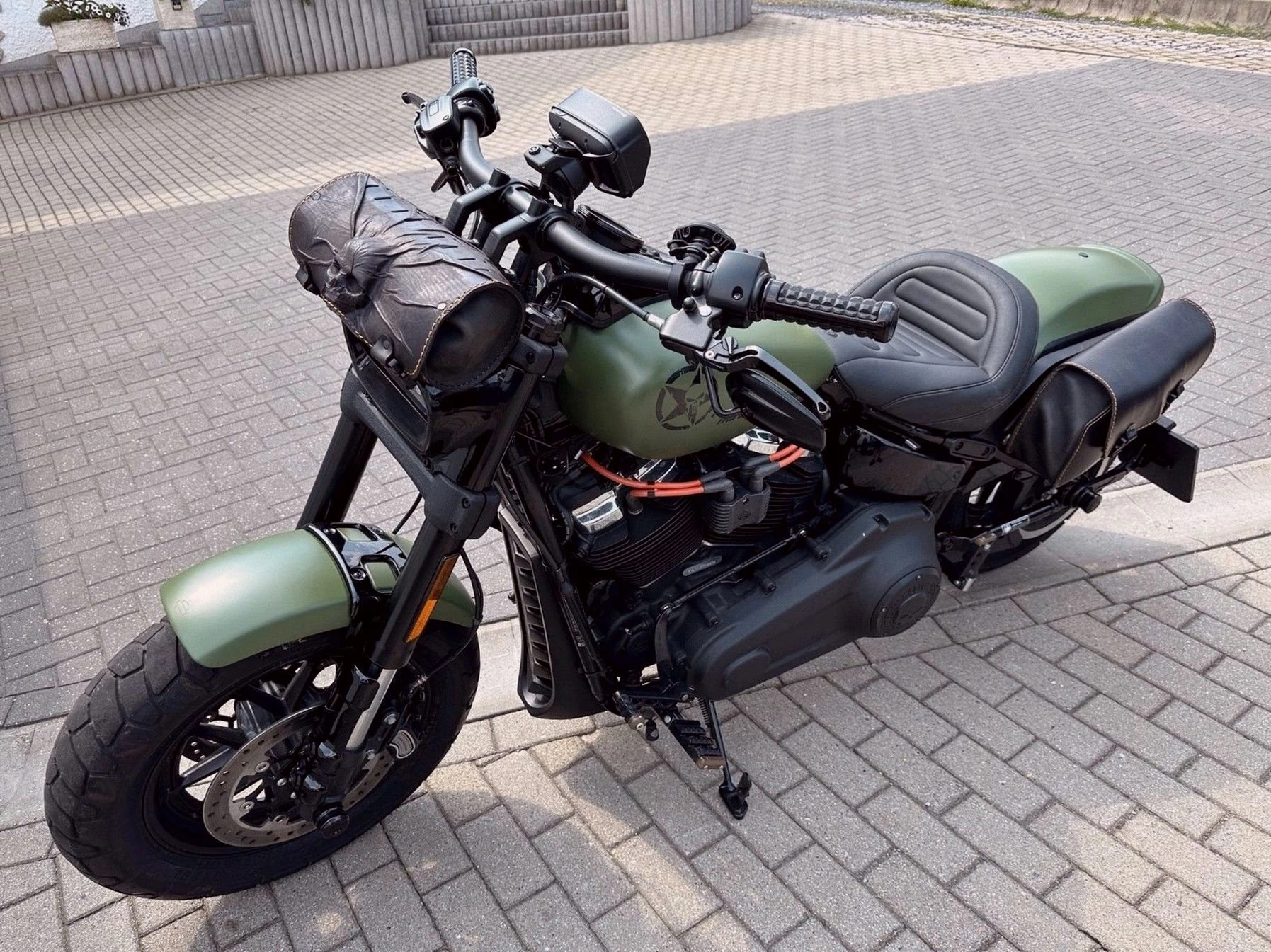 Wenig gefahrene Fat Bob, Umfall- & Unfallfrei, Matt grün lackiert, div. Um- & Anbauten: Jekill & Mr.Hyde Klappenauspuff (genialer Klang), Screamin Eagle Luftfilter von Bertl's (mit Mapping und Kombigutachten), 3 Taschen von Rarebag, Mustang Einzelsitzbank (sehr bequem), zus. Mustang Soziussitz mit 1 Schraube bei Bedarf montierbar, Sissybar mit Gepäckträger (nur einklicken - Werkzeuglos montierbar), Bugspoiler, Nano LED Blinker HeinzBikes vorn & hinten, seitl. Kennzeichenhalterung, Quadlook Motorradhalterung für Smartphone mit Schwingungsdämpfer, Tom-Tom Rider 550 mit Wunderlich Sonnenblende, Achscover vorn & hinten, weitestgehend schwarze Schraubenköpfe, schwarzes Schaltgestänge, abschließbarer schw. Tankdeckel mit HD Logo, Derby- & Timerdeckel in schwarz mit Willy-G Logo, Dominion Pedale vorn & hinten sowie Schalt- & Bremshebel, Orange Zündkabel, Kupplungs- & Bremshebel probrake Set Core Dark Black, Doppelsitzbank mit Aufpolsterung von TopSellerie grün abgesteppt inkl. Logo.