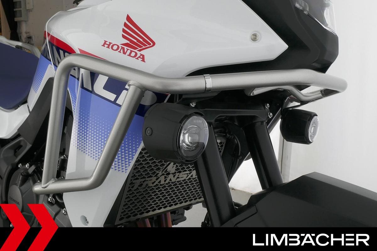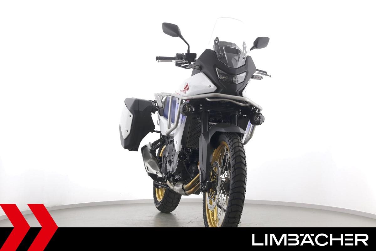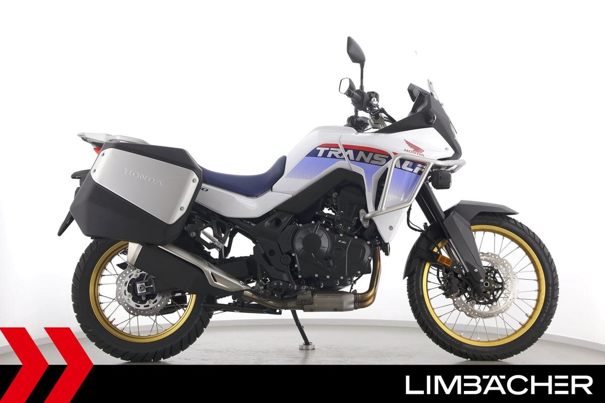 Eine Honda XL 750 Transalp als Neufahrzeug u.a. mit Seitenkoffer-System und Zusatzscheinwerfern.