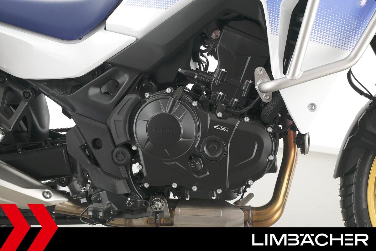 Eine Honda XL 750 Transalp als Neufahrzeug u.a. mit Seitenkoffer-System und Zusatzscheinwerfern.