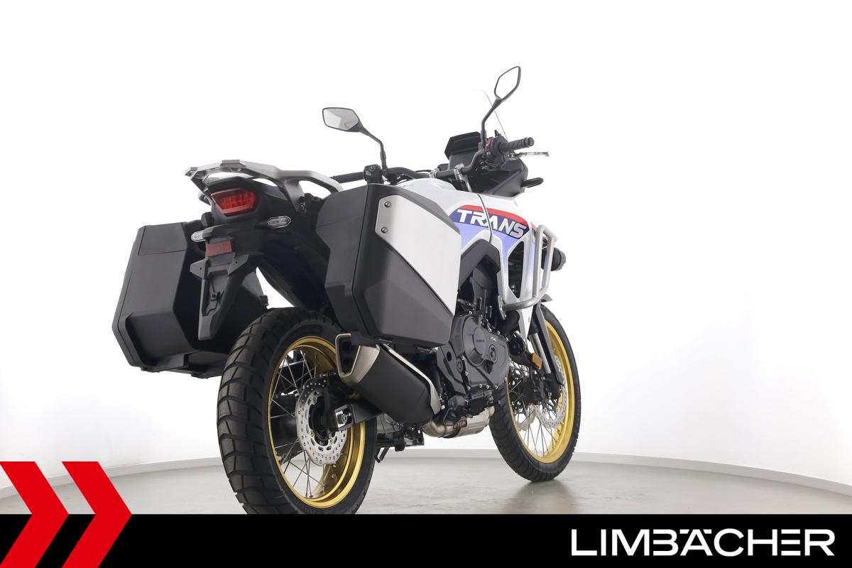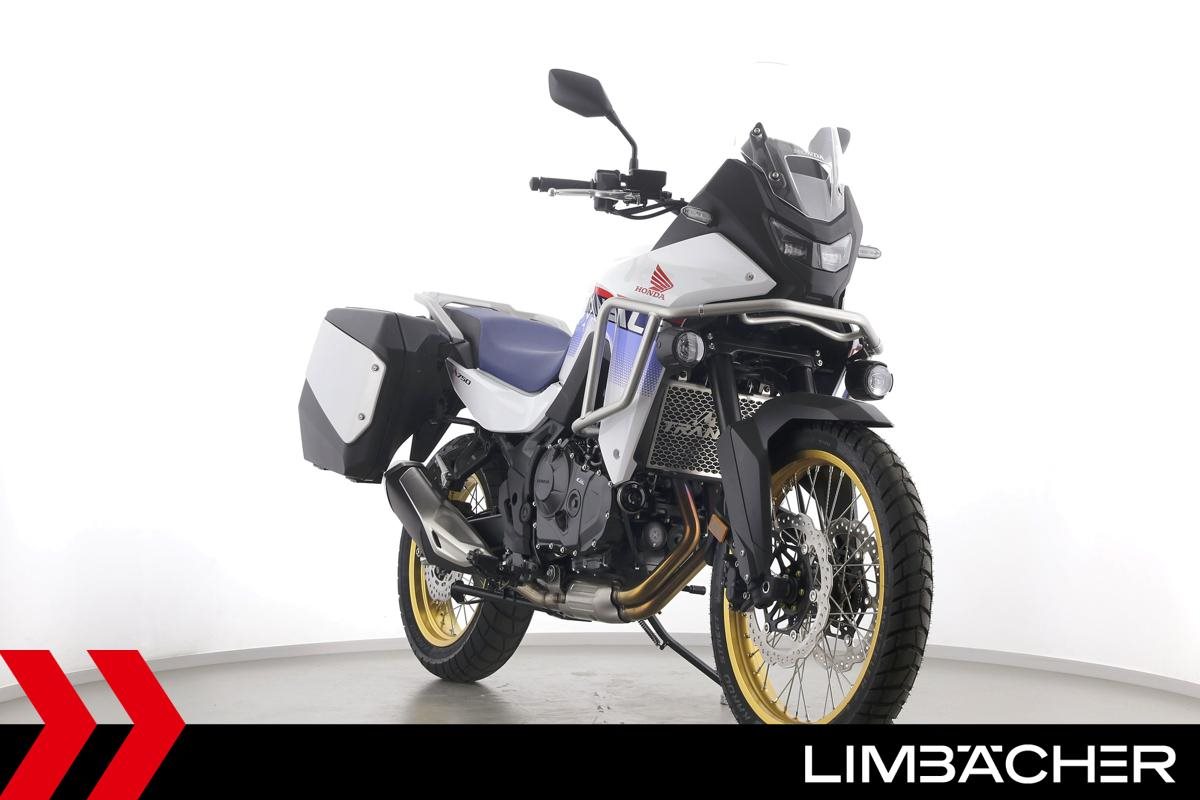 Eine Honda XL 750 Transalp als Neufahrzeug u.a. mit Seitenkoffer-System und Zusatzscheinwerfern.