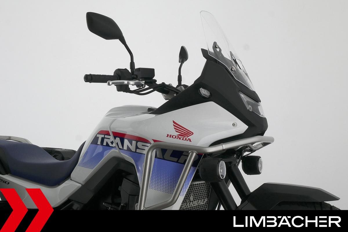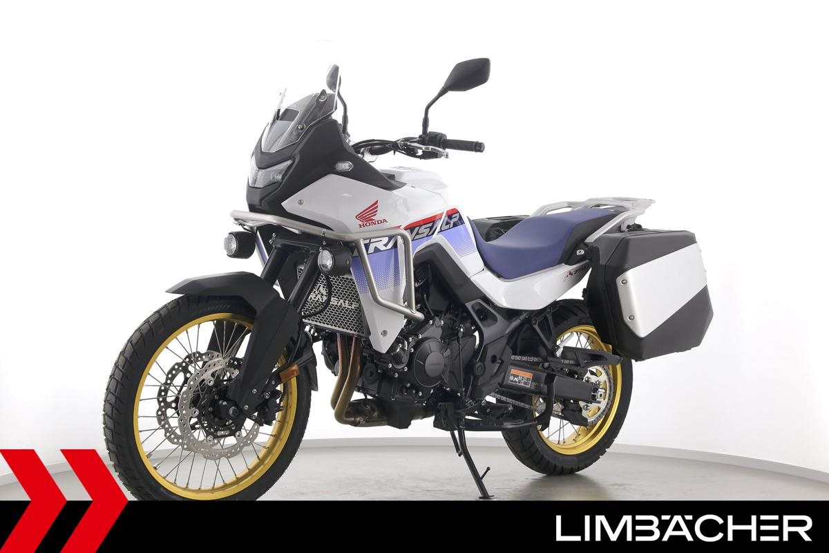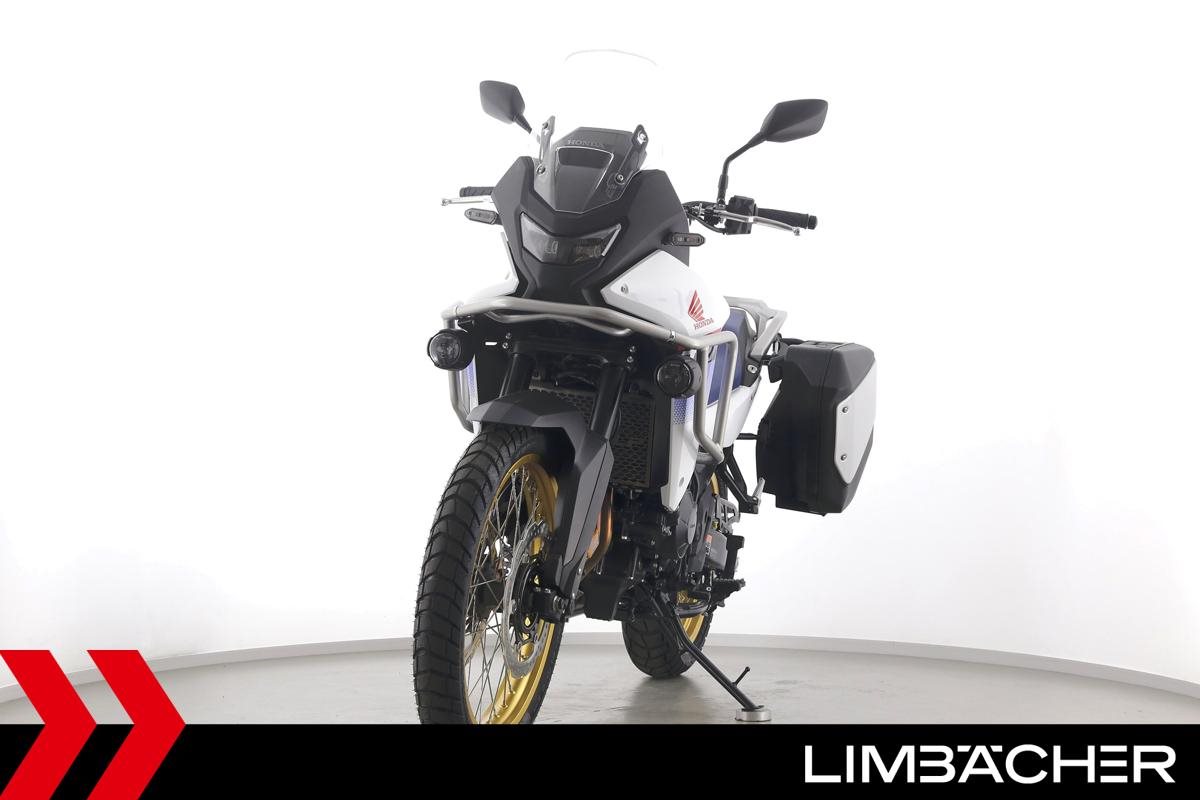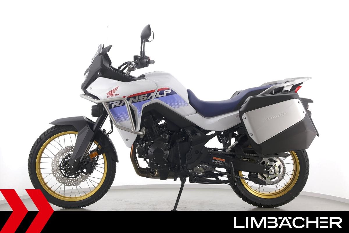 Eine Honda XL 750 Transalp als Neufahrzeug u.a. mit Seitenkoffer-System und Zusatzscheinwerfern.