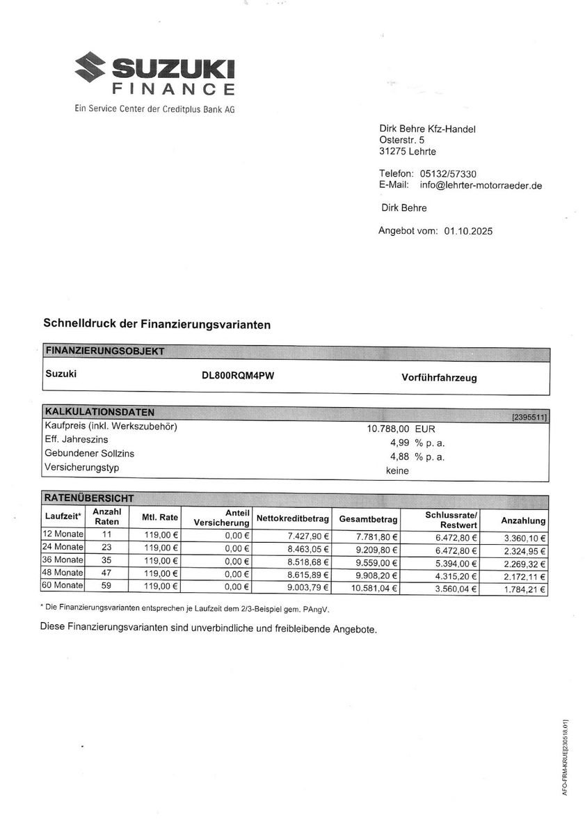 - Da schaut man zweimal hinDas Styling der V-Strom 800DE übersetzt die Formensprache des legendären Desert-Racers DR-Z ins 21. Jahrhundert. Über dem charakteristischen Schnabel eine kompakte LED-Einheit, die in ihrer Aggressivität so manchem Fighter gut zu Gesicht stünde. Dazu ein Windschild im Rallye-Style und Protektoren. Einfach rundum Adventure-Spirit in Reinform. Barpreis ab Standort, Finanzierung auf Anfrage möglich. Inklusive Akrapovic ESD UVP 1299,- €