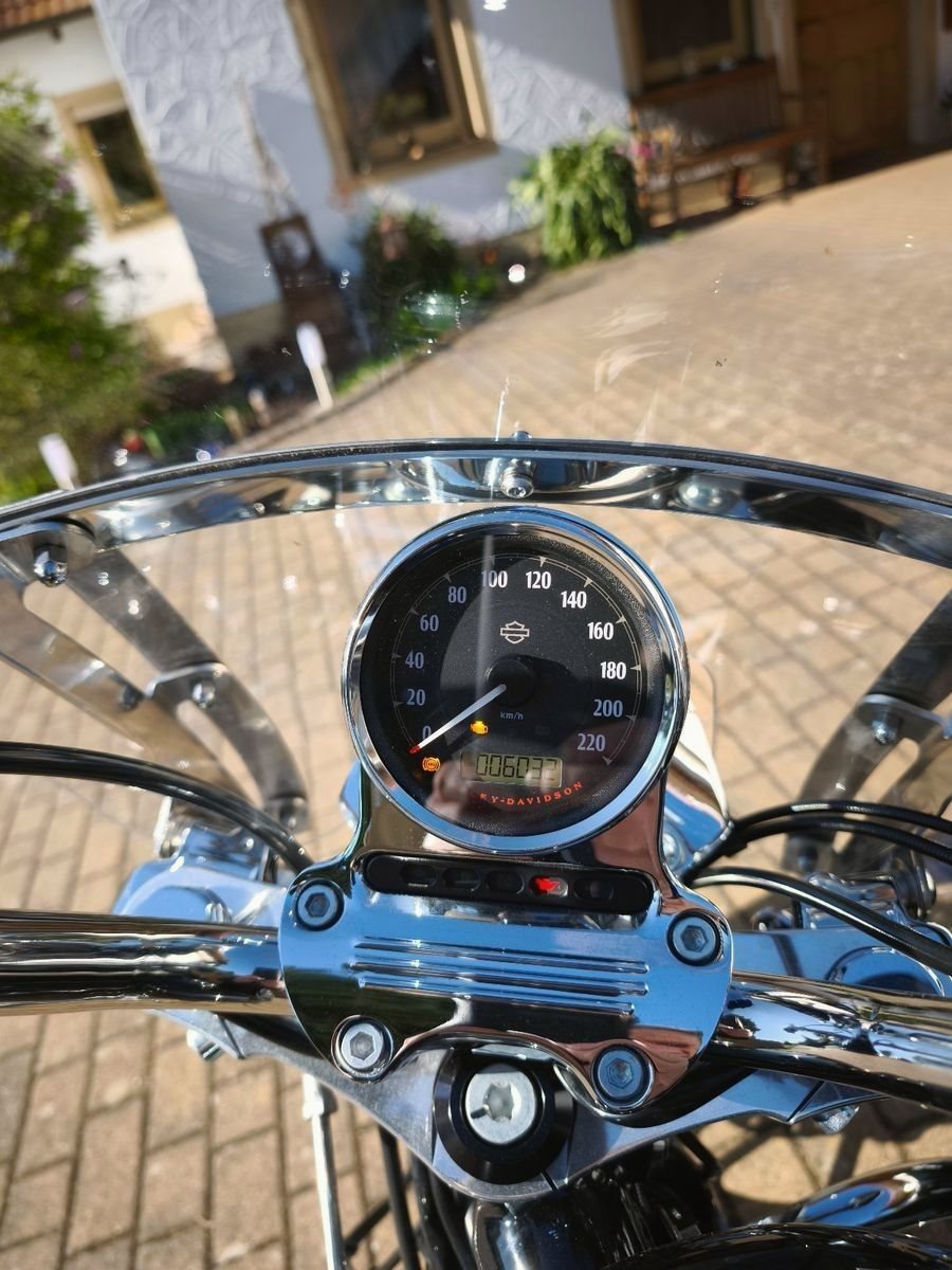Schutzbügel, Sissybar, Gepäckträger, vorverlegte Fußrastenanlage und um 5° verlängerte Vorderradgabel, abgedunkelte Rückleuchte und Blinker.