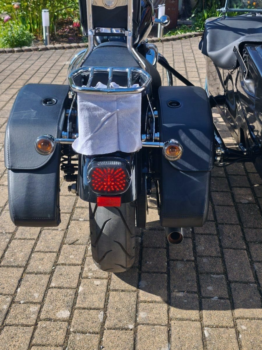 Gepäckträger, Oldtimer-Windschutzscheibe sowie orginal Harley-Davidson abgedunkelte Heckleuchte und Blinker.