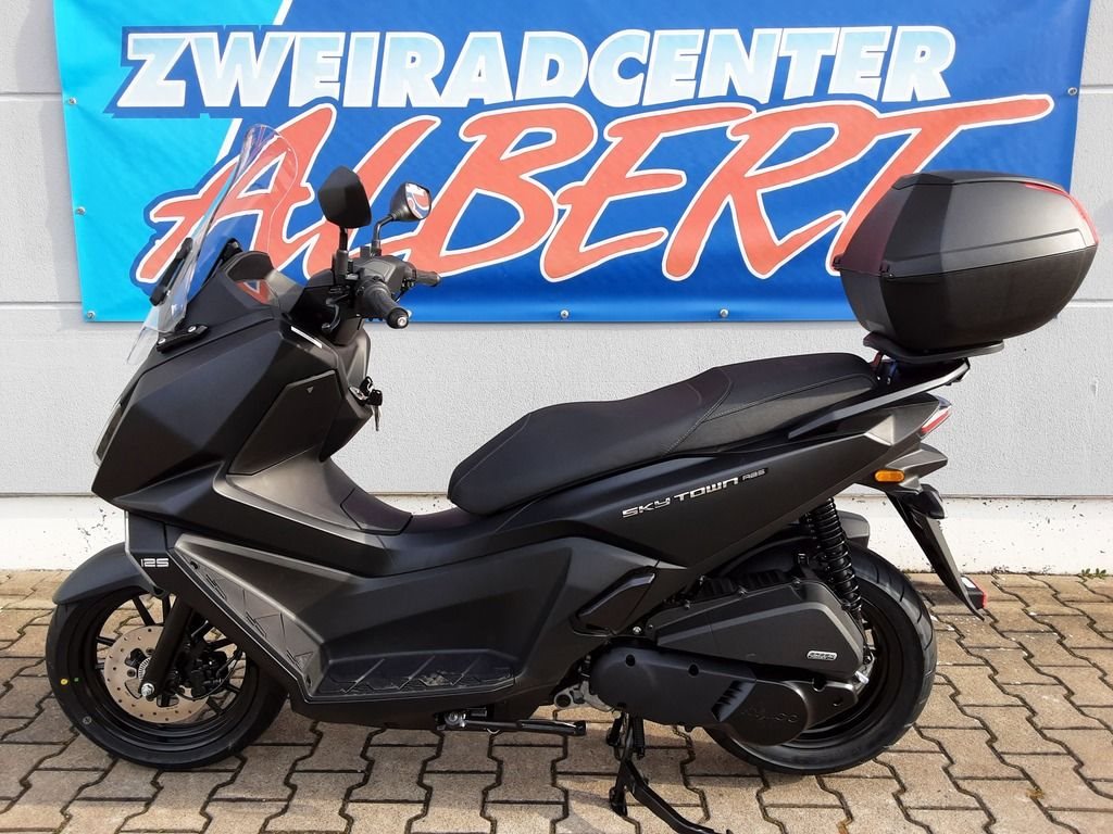 Im Alltag punktet der SKY TOWN 125i ABS mit einem praktischen Stauraum unter der Sitzbank, der Platz für einen Integralhelm bietet, sowie mit einem serienmäßigen Topcase zur Erweiterung des Ladevolumens. Ein USB-Anschluss (Typ A & C) ermöglicht das bequeme Laden mobiler Geräte. Das LCD-Dashboard zeigt alle relevanten Fahrdaten übersichtlich an, das Windschild sorgt zudem für verbesserten Komfort bei längeren Strecken.