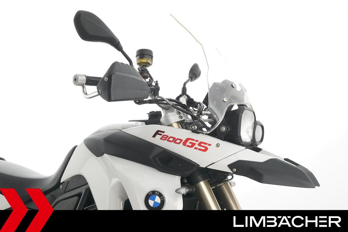 Eine BMW F 800 GS in gebrauchtem Zustand u.a. mit Drosselung auf 35 kW und Gepäckbrücke.